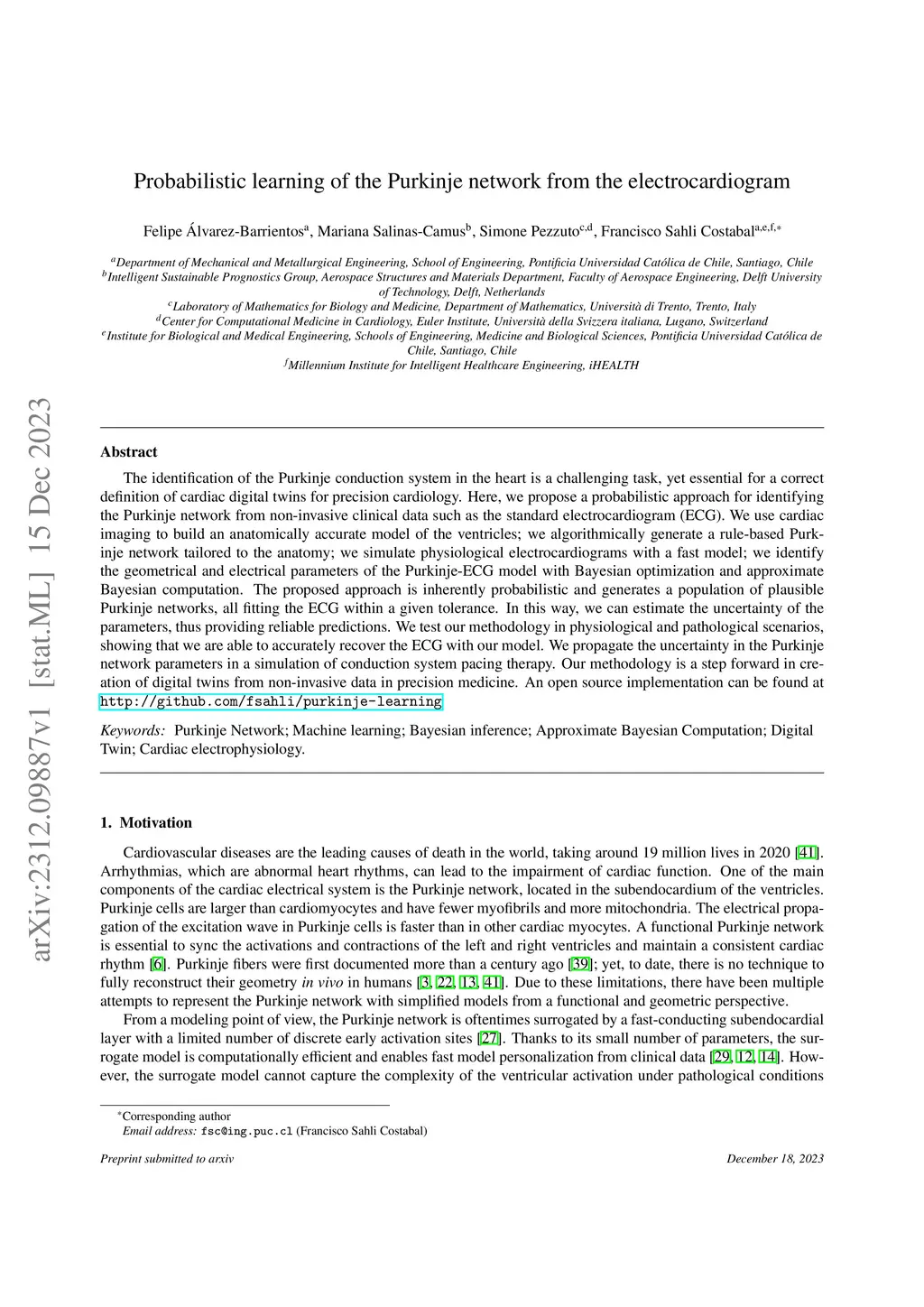 The identification of the Purkinje conduction system in the heart is a challenging task, yet essential for a correct definition of cardiac digital twins for precision cardiology. Here, we propose a probabilistic approach for identifying the Purkinje network from non-invasive clinical data such as the standard electrocardiogram (ECG). We use cardiac imaging to build an anatomically accurate model of the ventricles; we algorithmically generate a rule-based Purkinje network tailored to the anatomy; we simulate physiological electrocardiograms with a fast model; we identify the geometrical and electrical parameters of the Purkinje-ECG model with Bayesian optimization and approximate Bayesian computation. The proposed approach is inherently probabilistic and generates a population of plausible Purkinje networks, all fitting the ECG within a given tolerance. In this way, we can estimate the uncertainty of the parameters, thus providing reliable predictions. We test our methodology in physiological and pathological scenarios, showing that we are able to accurately recover the ECG with our model. We propagate the uncertainty in the Purkinje network parameters in a simulation of conduction system pacing therapy. Our methodology is a step forward in creation of digital twins from non-invasive data in precision medicine. An open source implementation can be found at http://github.com/fsahli/purkinje-learning