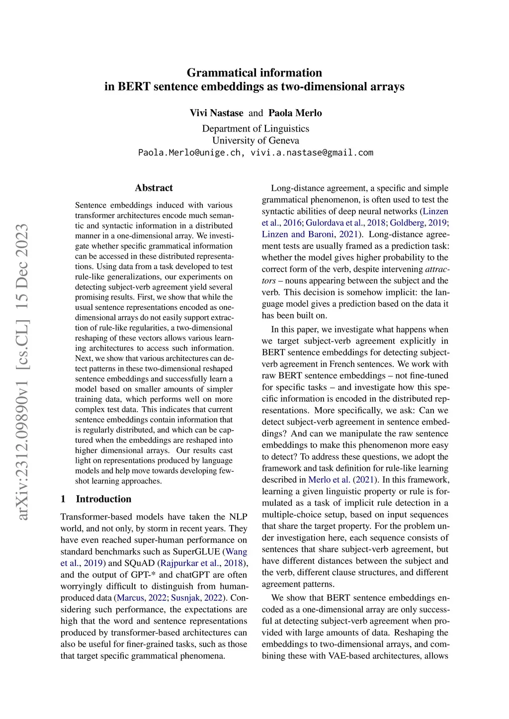 Sentence embeddings induced with various transformer architectures encode much semantic and syntactic information in a distributed manner in a one-dimensional array. We investigate whether specific grammatical information can be accessed in these distributed representations. Using data from a task developed to test rule-like generalizations, our experiments on detecting subject-verb agreement yield several promising results. First, we show that while the usual sentence representations encoded as one-dimensional arrays do not easily support extraction of rule-like regularities, a two-dimensional reshaping of these vectors allows various learning architectures to access such information. Next, we show that various architectures can detect patterns in these two-dimensional reshaped sentence embeddings and successfully learn a model based on smaller amounts of simpler training data, which performs well on more complex test data. This indicates that current sentence embeddings contain information that is regularly distributed, and which can be captured when the embeddings are reshaped into higher dimensional arrays. Our results cast light on representations produced by language models and help move towards developing few-shot learning approaches.