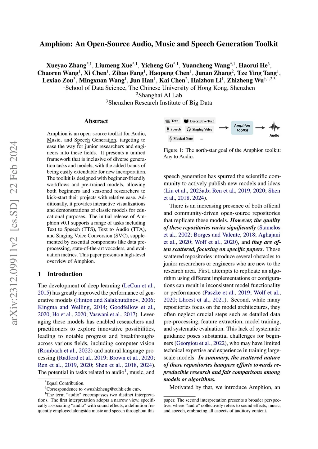 Amphion is an open-source toolkit for Audio, Music, and Speech Generation, targeting to ease the way for junior researchers and engineers into these fields. It presents a unified framework that is inclusive of diverse generation tasks and models, with the added bonus of being easily extendable for new incorporation. The toolkit is designed with beginner-friendly workflows and pre-trained models, allowing both beginners and seasoned researchers to kick-start their projects with relative ease. Additionally, it provides interactive visualizations and demonstrations of classic models for educational purposes. The initial release of Amphion v0.1 supports a range of tasks including Text to Speech (TTS), Text to Audio (TTA), and Singing Voice Conversion (SVC), supplemented by essential components like data preprocessing, state-of-the-art vocoders, and evaluation metrics. This paper presents a high-level overview of Amphion.