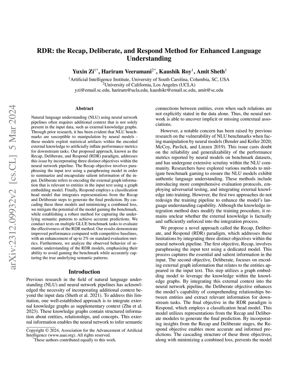 Natural language understanding (NLU) using neural network pipelines often requires additional context that is not solely present in the input data. Through Prior research, it has been evident that NLU benchmarks are susceptible to manipulation by neural models, wherein these models exploit statistical artifacts within the encoded external knowledge to artificially inflate performance metrics for downstream tasks. Our proposed approach, known as the Recap, Deliberate, and Respond (RDR) paradigm, addresses this issue by incorporating three distinct objectives within the neural network pipeline. Firstly, the Recap objective involves paraphrasing the input text using a paraphrasing model in order to summarize and encapsulate its essence. Secondly, the Deliberation objective entails encoding external graph information related to entities mentioned in the input text, utilizing a graph embedding model. Finally, the Respond objective employs a classification head model that utilizes representations from the Recap and Deliberation modules to generate the final prediction. By cascading these three models and minimizing a combined loss, we mitigate the potential for gaming the benchmark and establish a robust method for capturing the underlying semantic patterns, thus enabling accurate predictions. To evaluate the effectiveness of the RDR method, we conduct tests on multiple GLUE benchmark tasks. Our results demonstrate improved performance compared to competitive baselines, with an enhancement of up to 2\% on standard metrics. Furthermore, we analyze the observed evidence for semantic understanding exhibited by RDR models, emphasizing their ability to avoid gaming the benchmark and instead accurately capture the true underlying semantic patterns.