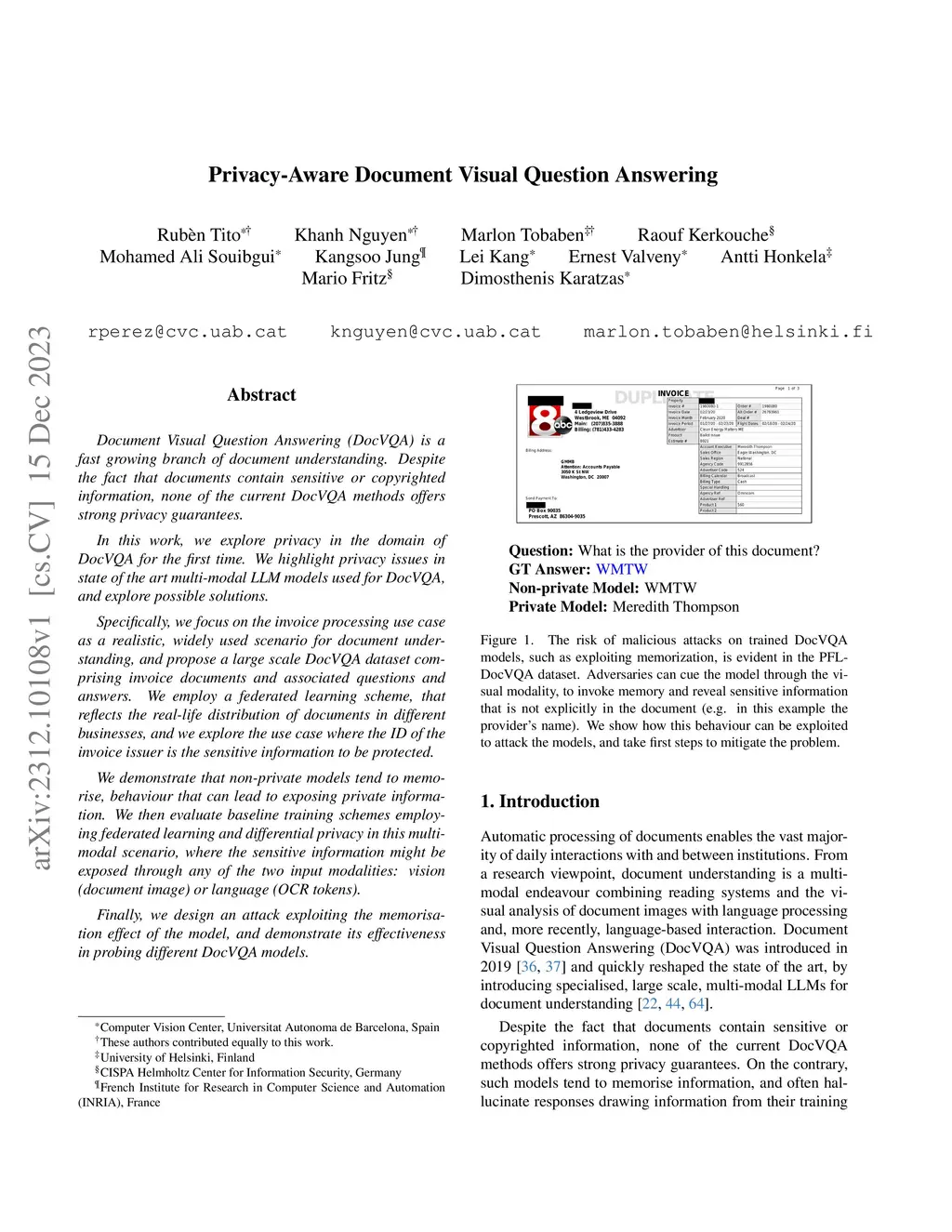 Document Visual Question Answering (DocVQA) is a fast growing branch of document understanding. Despite the fact that documents contain sensitive or copyrighted information, none of the current DocVQA methods offers strong privacy guarantees. In this work, we explore privacy in the domain of DocVQA for the first time. We highlight privacy issues in state of the art multi-modal LLM models used for DocVQA, and explore possible solutions. Specifically, we focus on the invoice processing use case as a realistic, widely used scenario for document understanding, and propose a large scale DocVQA dataset comprising invoice documents and associated questions and answers. We employ a federated learning scheme, that reflects the real-life distribution of documents in different businesses, and we explore the use case where the ID of the invoice issuer is the sensitive information to be protected. We demonstrate that non-private models tend to memorise, behaviour that can lead to exposing private information. We then evaluate baseline training schemes employing federated learning and differential privacy in this multi-modal scenario, where the sensitive information might be exposed through any of the two input modalities: vision (document image) or language (OCR tokens). Finally, we design an attack exploiting the memorisation effect of the model, and demonstrate its effectiveness in probing different DocVQA models.