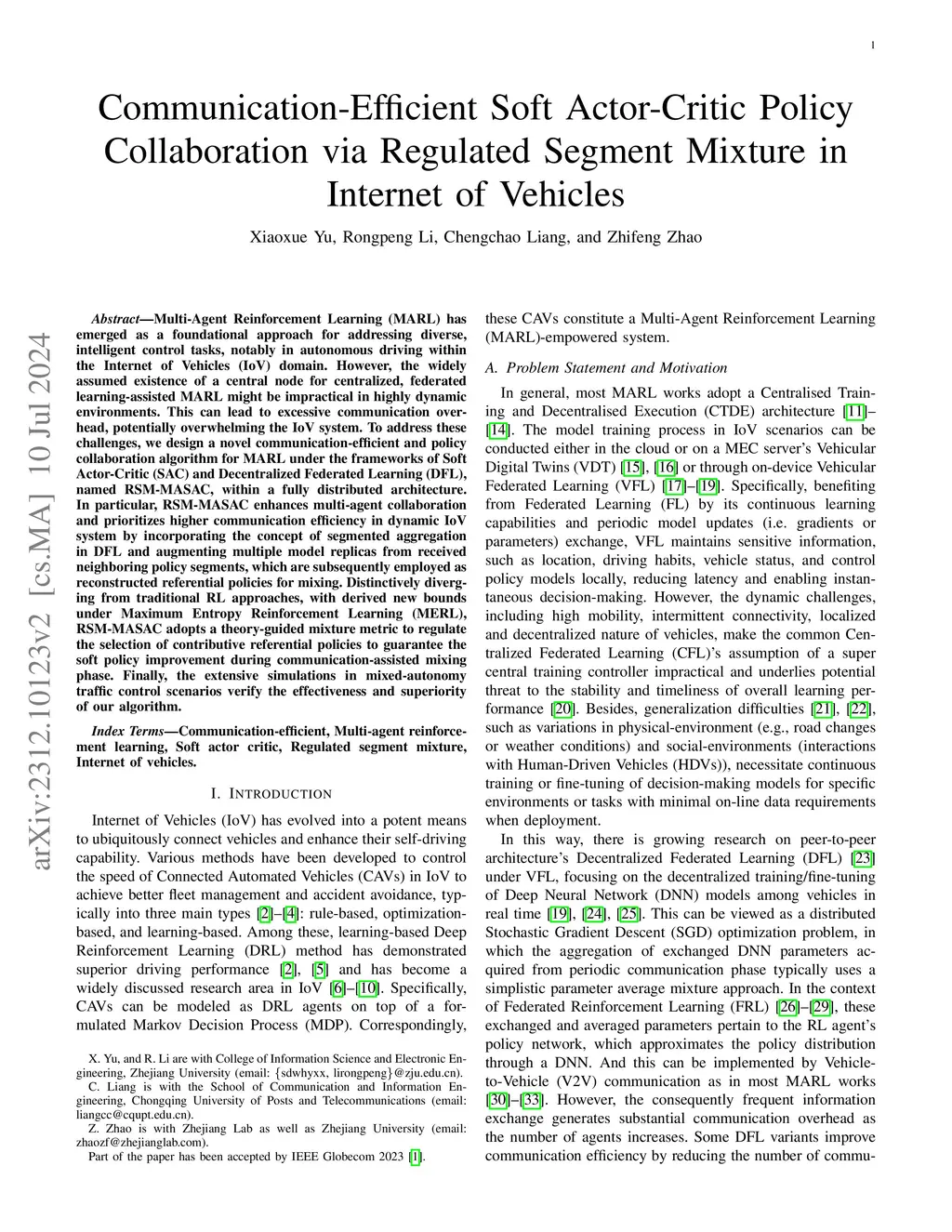 Multi-Agent Reinforcement Learning (MARL) has emerged as a foundational approach for addressing diverse, intelligent control tasks, notably in autonomous driving within the Internet of Vehicles (IoV) domain. However, the widely assumed existence of a central node for centralized, federated learning-assisted MARL might be impractical in highly dynamic environments. This can lead to excessive communication overhead, potentially overwhelming the IoV system. To address these challenges, we design a novel communication-efficient and policy collaboration algorithm for MARL under the frameworks of Soft Actor-Critic (SAC) and Decentralized Federated Learning (DFL), named RSM-MASAC, within a fully distributed architecture. In particular, RSM-MASAC enhances multi-agent collaboration and prioritizes higher communication efficiency in dynamic IoV system by incorporating the concept of segmented aggregation in DFL and augmenting multiple model replicas from received neighboring policy segments, which are subsequently employed as reconstructed referential policies for mixing. Distinctively diverging from traditional RL approaches, with derived new bounds under Maximum Entropy Reinforcement Learning (MERL), RSM-MASAC adopts a theory-guided mixture metric to regulate the selection of contributive referential policies to guarantee the soft policy improvement during communication phase. Finally, the extensive simulations in mixed-autonomy traffic control scenarios verify the effectiveness and superiority of our algorithm.
