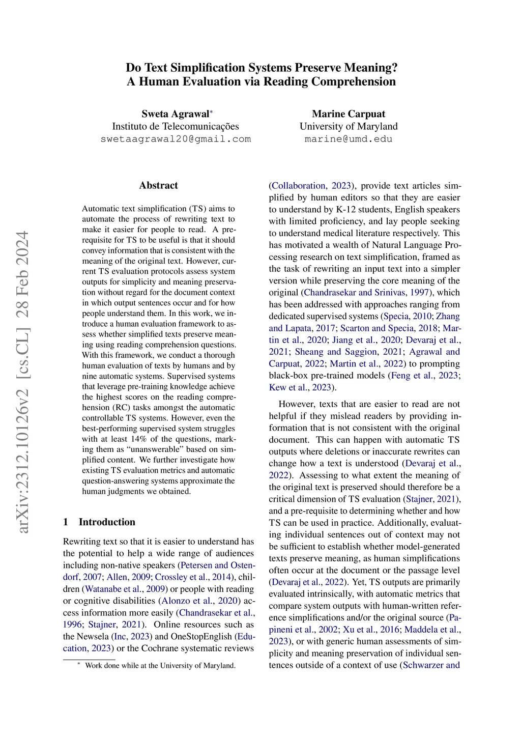 Automatic text simplification (TS) aims to automate the process of rewriting text to make it easier for people to read. A pre-requisite for TS to be useful is that it should convey information that is consistent with the meaning of the original text. However, current TS evaluation protocols assess system outputs for simplicity and meaning preservation without regard for the document context in which output sentences occur and for how people understand them. In this work, we introduce a human evaluation framework to assess whether simplified texts preserve meaning using reading comprehension questions. With this framework, we conduct a thorough human evaluation of texts by humans and by nine automatic systems. Supervised systems that leverage pre-training knowledge achieve the highest scores on the reading comprehension (RC) tasks amongst the automatic controllable TS systems. However, even the best-performing supervised system struggles with at least 14% of the questions, marking them as "unanswerable'' based on simplified content. We further investigate how existing TS evaluation metrics and automatic question-answering systems approximate the human judgments we obtained.