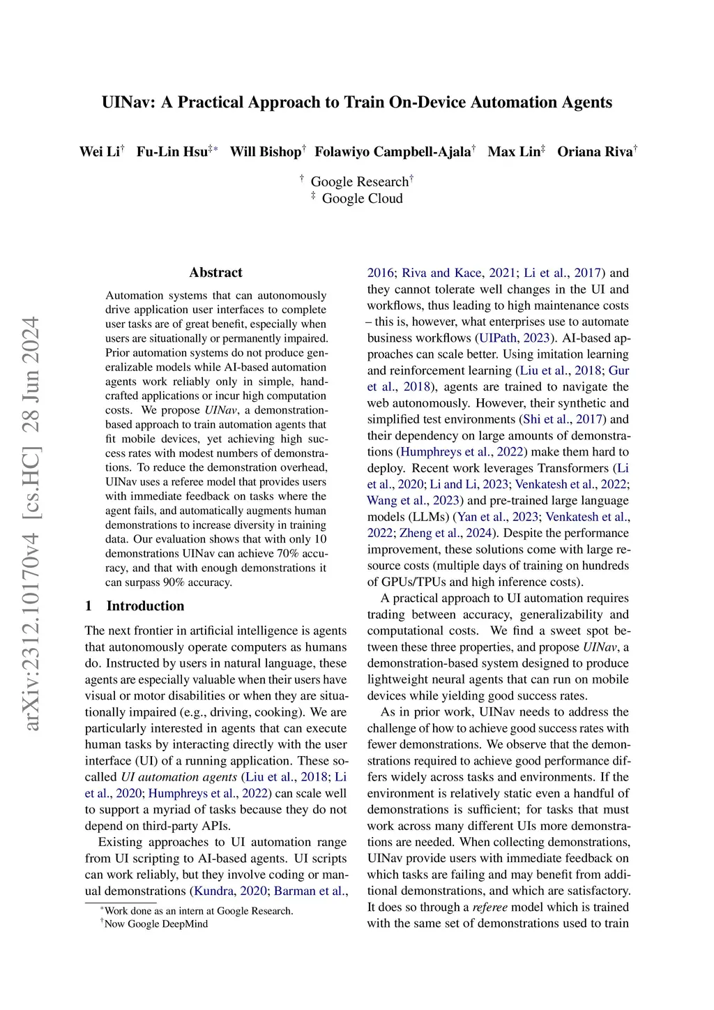 Automation systems that can autonomously drive application user interfaces to complete user tasks are of great benefit, especially when users are situationally or permanently impaired. Prior automation systems do not produce generalizable models while AI-based automation agents work reliably only in simple, hand-crafted applications or incur high computation costs. We propose UINav, a demonstration-based approach to train automation agents that fit mobile devices, yet achieving high success rates with modest numbers of demonstrations. To reduce the demonstration overhead, UINav uses a referee model that provides users with immediate feedback on tasks where the agent fails, and automatically augments human demonstrations to increase diversity in training data. Our evaluation shows that with only 10 demonstrations UINav can achieve 70% accuracy, and that with enough demonstrations it can surpass 90% accuracy.