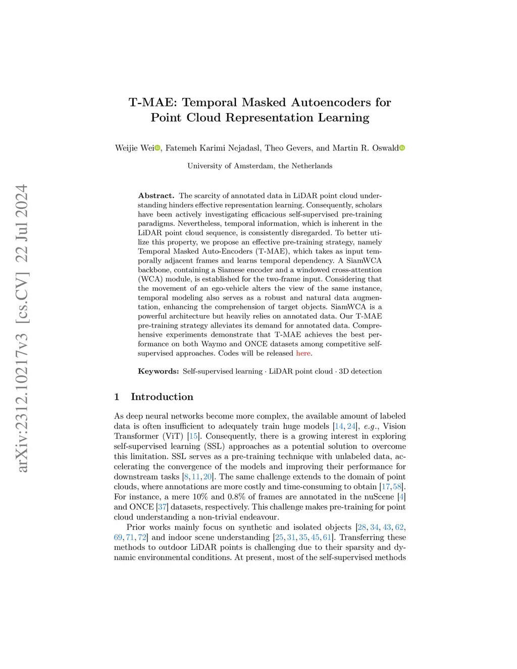 T-MAE: Temporal Masked Autoencoders for Point Cloud Representation
