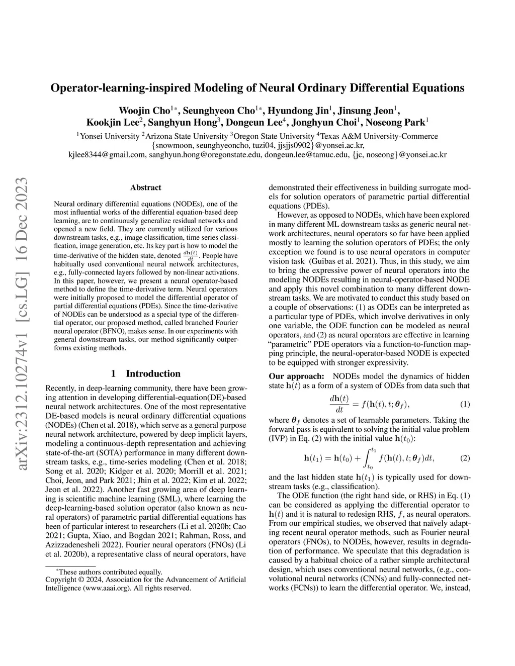 Neural ordinary differential equations (NODEs), one of the most influential works of the differential equation-based deep learning, are to continuously generalize residual networks and opened a new field. They are currently utilized for various downstream tasks, e.g., image classification, time series classification, image generation, etc. Its key part is how to model the time-derivative of the hidden state, denoted dh(t)/dt. People have habitually used conventional neural network architectures, e.g., fully-connected layers followed by non-linear activations. In this paper, however, we present a neural operator-based method to define the time-derivative term. Neural operators were initially proposed to model the differential operator of partial differential equations (PDEs). Since the time-derivative of NODEs can be understood as a special type of the differential operator, our proposed method, called branched Fourier neural operator (BFNO), makes sense. In our experiments with general downstream tasks, our method significantly outperforms existing methods.