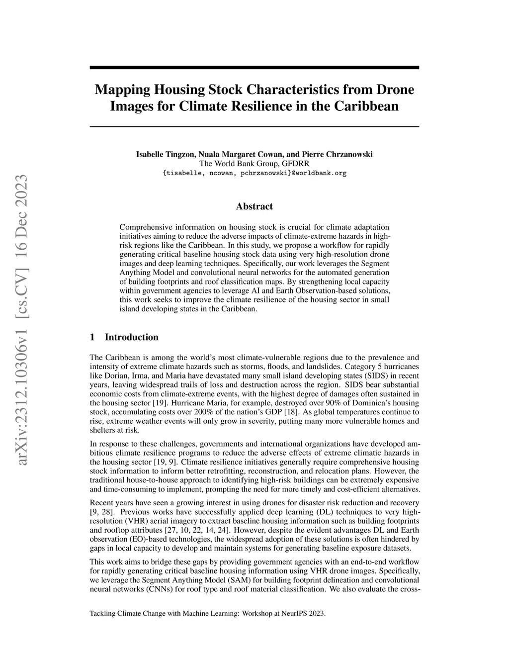 Comprehensive information on housing stock is crucial for climate adaptation initiatives aiming to reduce the adverse impacts of climate-extreme hazards in high-risk regions like the Caribbean. In this study, we propose a workflow for rapidly generating critical baseline housing stock data using very high-resolution drone images and deep learning techniques. Specifically, our work leverages the Segment Anything Model and convolutional neural networks for the automated generation of building footprints and roof classification maps. By strengthening local capacity within government agencies to leverage AI and Earth Observation-based solutions, this work seeks to improve the climate resilience of the housing sector in small island developing states in the Caribbean.