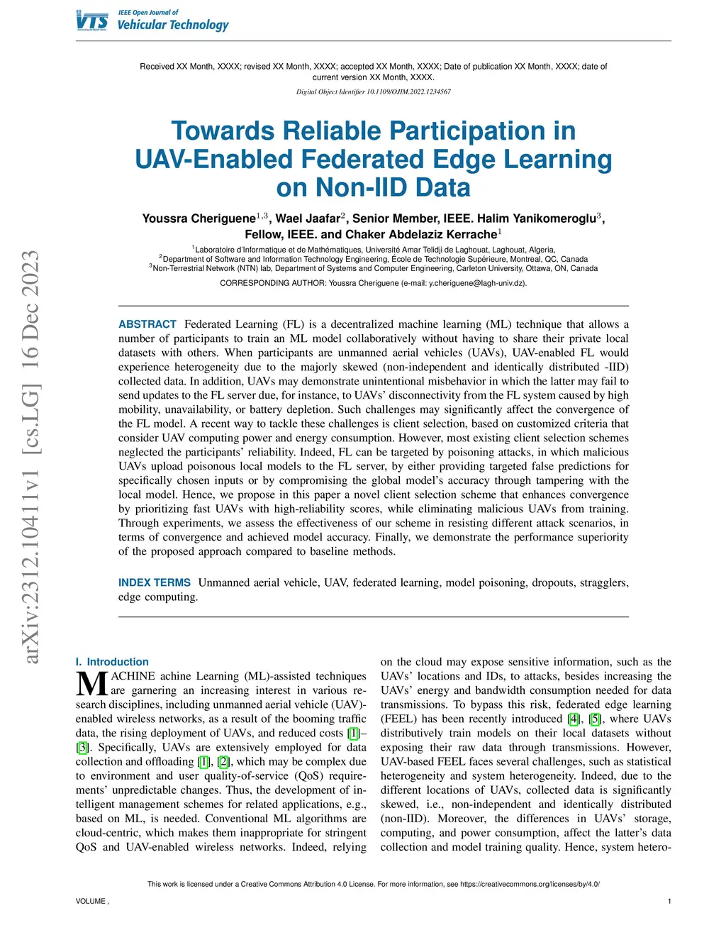 Federated Learning (FL) is a decentralized machine learning (ML) technique that allows a number of participants to train an ML model collaboratively without having to share their private local datasets with others. When participants are unmanned aerial vehicles (UAVs), UAV-enabled FL would experience heterogeneity due to the majorly skewed (non-independent and identically distributed -IID) collected data. In addition, UAVs may demonstrate unintentional misbehavior in which the latter may fail to send updates to the FL server due, for instance, to UAVs' disconnectivity from the FL system caused by high mobility, unavailability, or battery depletion. Such challenges may significantly affect the convergence of the FL model. A recent way to tackle these challenges is client selection, based on customized criteria that consider UAV computing power and energy consumption. However, most existing client selection schemes neglected the participants' reliability. Indeed, FL can be targeted by poisoning attacks, in which malicious UAVs upload poisonous local models to the FL server, by either providing targeted false predictions for specifically chosen inputs or by compromising the global model's accuracy through tampering with the local model. Hence, we propose in this paper a novel client selection scheme that enhances convergence by prioritizing fast UAVs with high-reliability scores, while eliminating malicious UAVs from training. Through experiments, we assess the effectiveness of our scheme in resisting different attack scenarios, in terms of convergence and achieved model accuracy. Finally, we demonstrate the performance superiority of the proposed approach compared to baseline methods.