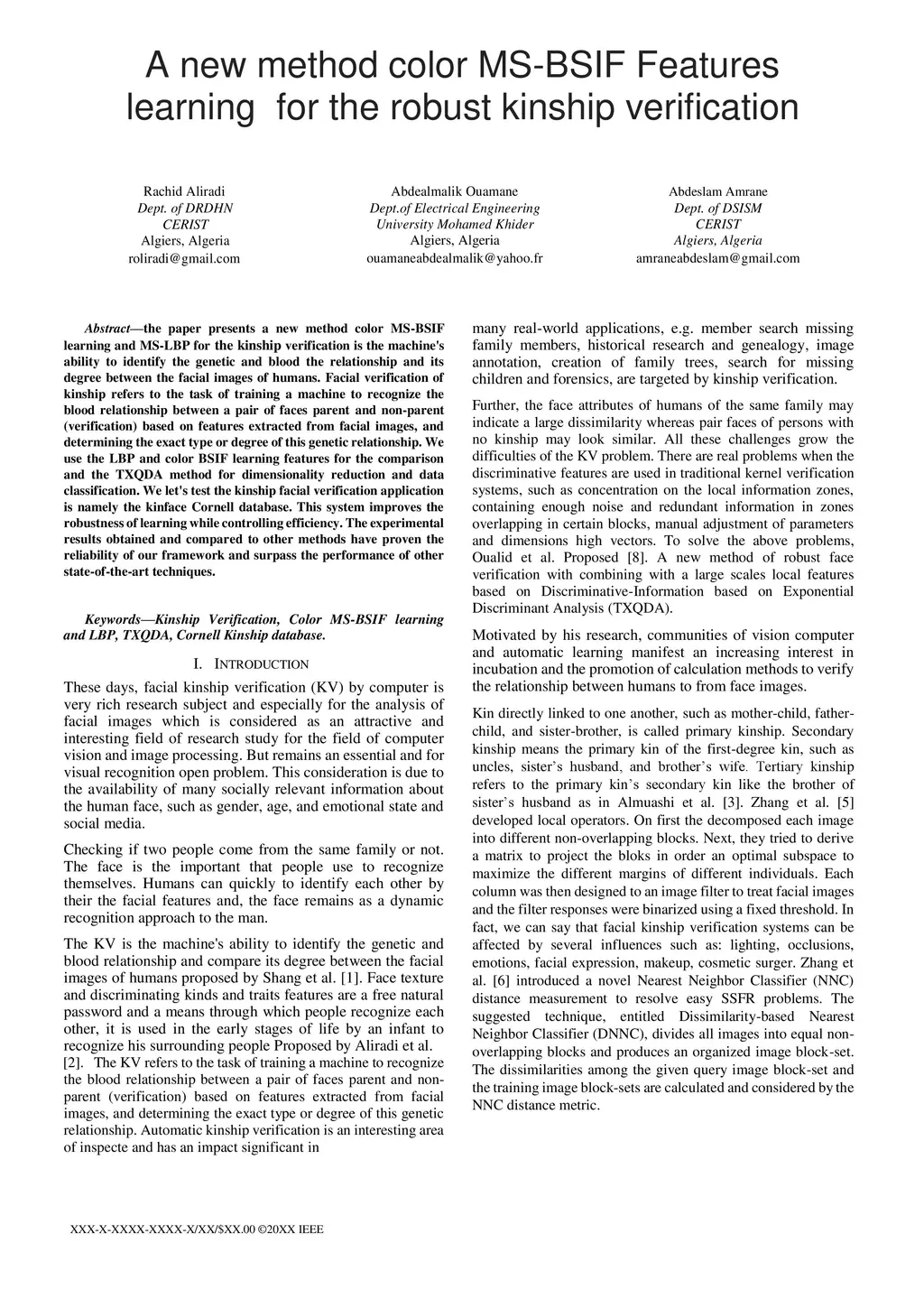 the paper presents a new method color MS-BSIF learning and MS-LBP for the kinship verification is the machine's ability to identify the genetic and blood the relationship and its degree between the facial images of humans. Facial verification of kinship refers to the task of training a machine to recognize the blood relationship between a pair of faces parent and non-parent (verification) based on features extracted from facial images, and determining the exact type or degree of this genetic relationship. We use the LBP and color BSIF learning features for the comparison and the TXQDA method for dimensionality reduction and data classification. We let's test the kinship facial verification application is namely the kinface Cornell database. This system improves the robustness of learning while controlling efficiency. The experimental results obtained and compared to other methods have proven the reliability of our framework and surpass the performance of other state-of-the-art techniques.