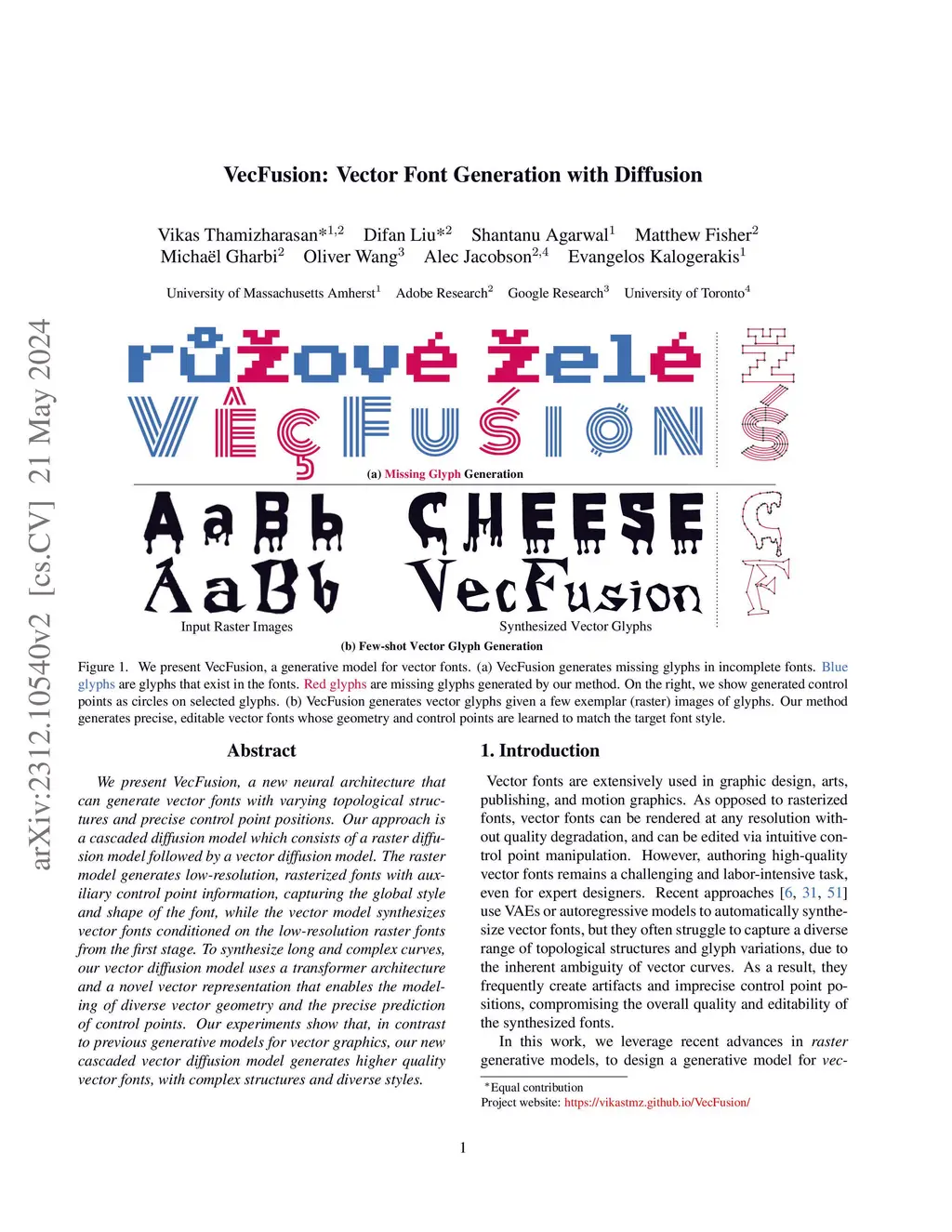 We present VecFusion, a new neural architecture that can generate vector fonts with varying topological structures and precise control point positions. Our approach is a cascaded diffusion model which consists of a raster diffusion model followed by a vector diffusion model. The raster model generates low-resolution, rasterized fonts with auxiliary control point information, capturing the global style and shape of the font, while the vector model synthesizes vector fonts conditioned on the low-resolution raster fonts from the first stage. To synthesize long and complex curves, our vector diffusion model uses a transformer architecture and a novel vector representation that enables the modeling of diverse vector geometry and the precise prediction of control points. Our experiments show that, in contrast to previous generative models for vector graphics, our new cascaded vector diffusion model generates higher quality vector fonts, with complex structures and diverse styles.