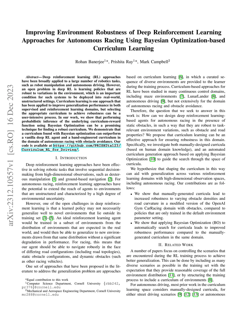 Deep reinforcement learning (RL) approaches have been broadly applied to a large number of robotics tasks, such as robot manipulation and autonomous driving. However, an open problem in deep RL is learning policies that are robust to variations in the environment, which is an important condition for such systems to be deployed into real-world, unstructured settings. Curriculum learning is one approach that has been applied to improve generalization performance in both supervised and reinforcement learning domains, but selecting the appropriate curriculum to achieve robustness can be a user-intensive process. In our work, we show that performing probabilistic inference of the underlying curriculum-reward function using Bayesian Optimization can be a promising technique for finding a robust curriculum. We demonstrate that a curriculum found with Bayesian optimization can outperform a vanilla deep RL agent and a hand-engineered curriculum in the domain of autonomous racing with obstacle avoidance. Our code is available at https://github.com/PRISHIta123/Curriculum_RL_for_Driving.