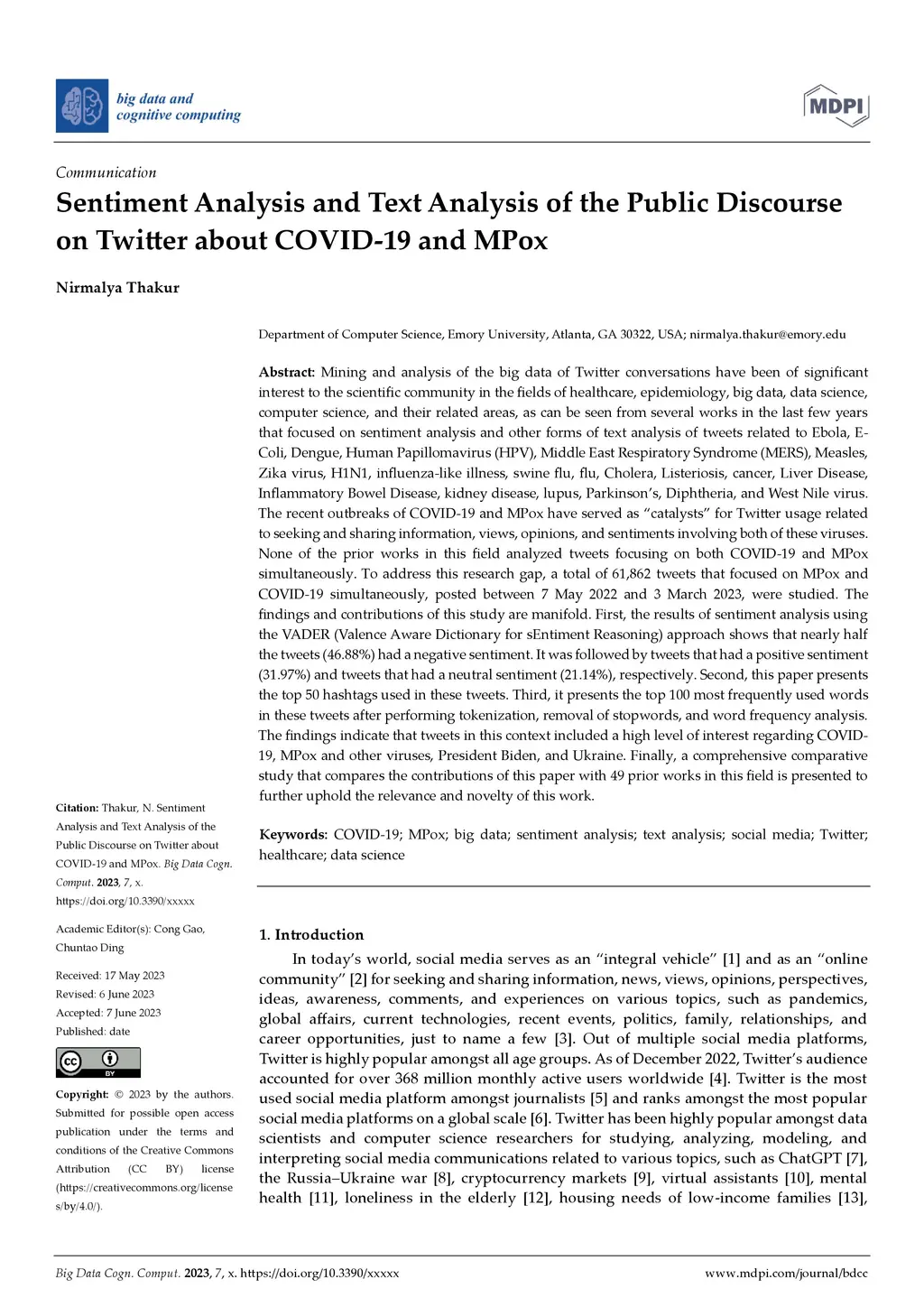 Mining and analysis of the big data of Twitter conversations have been of significant interest to the scientific community in the fields of healthcare, epidemiology, big data, data science, computer science, and their related areas, as can be seen from several works in the last few years that focused on sentiment analysis and other forms of text analysis of tweets related to Ebola, E-Coli, Dengue, Human Papillomavirus, Middle East Respiratory Syndrome, Measles, Zika virus, H1N1, influenza like illness, swine flu, flu, Cholera, Listeriosis, cancer, Liver Disease, Inflammatory Bowel Disease, kidney disease, lupus, Parkinsons, Diphtheria, and West Nile virus. The recent outbreaks of COVID-19 and MPox have served as catalysts for Twitter usage related to seeking and sharing information, views, opinions, and sentiments involving both of these viruses. None of the prior works in this field analyzed tweets focusing on both COVID-19 and MPox simultaneously. To address this research gap, a total of 61,862 tweets that focused on MPox and COVID-19 simultaneously, posted between 7 May 2022 and 3 March 2023, were studied. The findings and contributions of this study are manifold. First, the results of sentiment analysis using the VADER approach show that nearly half the tweets had a negative sentiment. It was followed by tweets that had a positive sentiment and tweets that had a neutral sentiment, respectively. Second, this paper presents the top 50 hashtags used in these tweets. Third, it presents the top 100 most frequently used words in these tweets after performing tokenization, removal of stopwords, and word frequency analysis. Finally, a comprehensive comparative study that compares the contributions of this paper with 49 prior works in this field is presented to further uphold the relevance and novelty of this work.