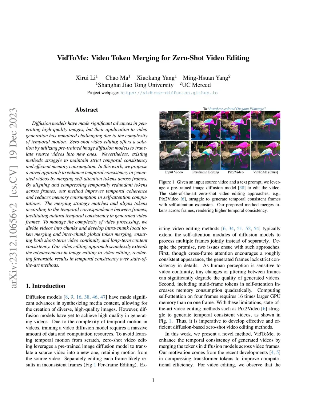Diffusion models have made significant advances in generating high-quality images, but their application to video generation has remained challenging due to the complexity of temporal motion. Zero-shot video editing offers a solution by utilizing pre-trained image diffusion models to translate source videos into new ones. Nevertheless, existing methods struggle to maintain strict temporal consistency and efficient memory consumption. In this work, we propose a novel approach to enhance temporal consistency in generated videos by merging self-attention tokens across frames. By aligning and compressing temporally redundant tokens across frames, our method improves temporal coherence and reduces memory consumption in self-attention computations. The merging strategy matches and aligns tokens according to the temporal correspondence between frames, facilitating natural temporal consistency in generated video frames. To manage the complexity of video processing, we divide videos into chunks and develop intra-chunk local token merging and inter-chunk global token merging, ensuring both short-term video continuity and long-term content consistency. Our video editing approach seamlessly extends the advancements in image editing to video editing, rendering favorable results in temporal consistency over state-of-the-art methods.