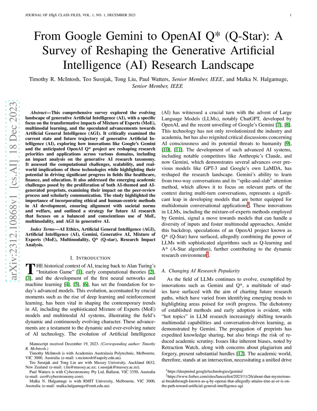 This comprehensive survey explored the evolving landscape of generative Artificial Intelligence (AI), with a specific focus on the transformative impacts of Mixture of Experts (MoE), multimodal learning, and the speculated advancements towards Artificial General Intelligence (AGI). It critically examined the current state and future trajectory of generative Artificial Intelligence (AI), exploring how innovations like Google's Gemini and the anticipated OpenAI Q* project are reshaping research priorities and applications across various domains, including an impact analysis on the generative AI research taxonomy. It assessed the computational challenges, scalability, and real-world implications of these technologies while highlighting their potential in driving significant progress in fields like healthcare, finance, and education. It also addressed the emerging academic challenges posed by the proliferation of both AI-themed and AI-generated preprints, examining their impact on the peer-review process and scholarly communication. The study highlighted the importance of incorporating ethical and human-centric methods in AI development, ensuring alignment with societal norms and welfare, and outlined a strategy for future AI research that focuses on a balanced and conscientious use of MoE, multimodality, and AGI in generative AI.
