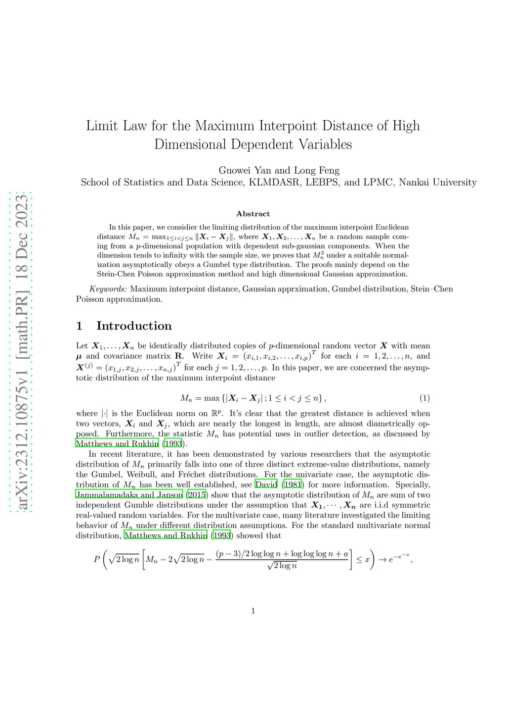 In this paper, we considier the limiting distribution of the maximum interpoint Euclidean distance , where be a random sample coming from a -dimensional population with dependent sub-gaussian components. When the dimension tends to infinity with the sample size, we proves that under a suitable normalization asymptotically obeys a Gumbel type distribution. The proofs mainly depend on the Stein-Chen Poisson approximation method and high dimensional Gaussian approximation.