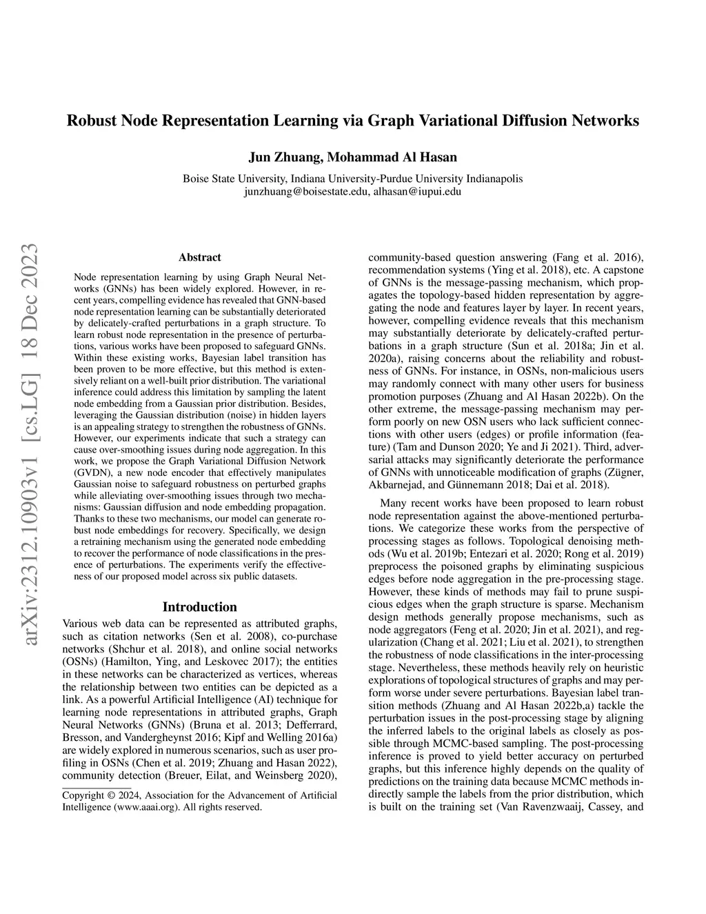 Node representation learning by using Graph Neural Networks (GNNs) has been widely explored. However, in recent years, compelling evidence has revealed that GNN-based node representation learning can be substantially deteriorated by delicately-crafted perturbations in a graph structure. To learn robust node representation in the presence of perturbations, various works have been proposed to safeguard GNNs. Within these existing works, Bayesian label transition has been proven to be more effective, but this method is extensively reliant on a well-built prior distribution. The variational inference could address this limitation by sampling the latent node embedding from a Gaussian prior distribution. Besides, leveraging the Gaussian distribution (noise) in hidden layers is an appealing strategy to strengthen the robustness of GNNs. However, our experiments indicate that such a strategy can cause over-smoothing issues during node aggregation. In this work, we propose the Graph Variational Diffusion Network (GVDN), a new node encoder that effectively manipulates Gaussian noise to safeguard robustness on perturbed graphs while alleviating over-smoothing issues through two mechanisms: Gaussian diffusion and node embedding propagation. Thanks to these two mechanisms, our model can generate robust node embeddings for recovery. Specifically, we design a retraining mechanism using the generated node embedding to recover the performance of node classifications in the presence of perturbations. The experiments verify the effectiveness of our proposed model across six public datasets.
