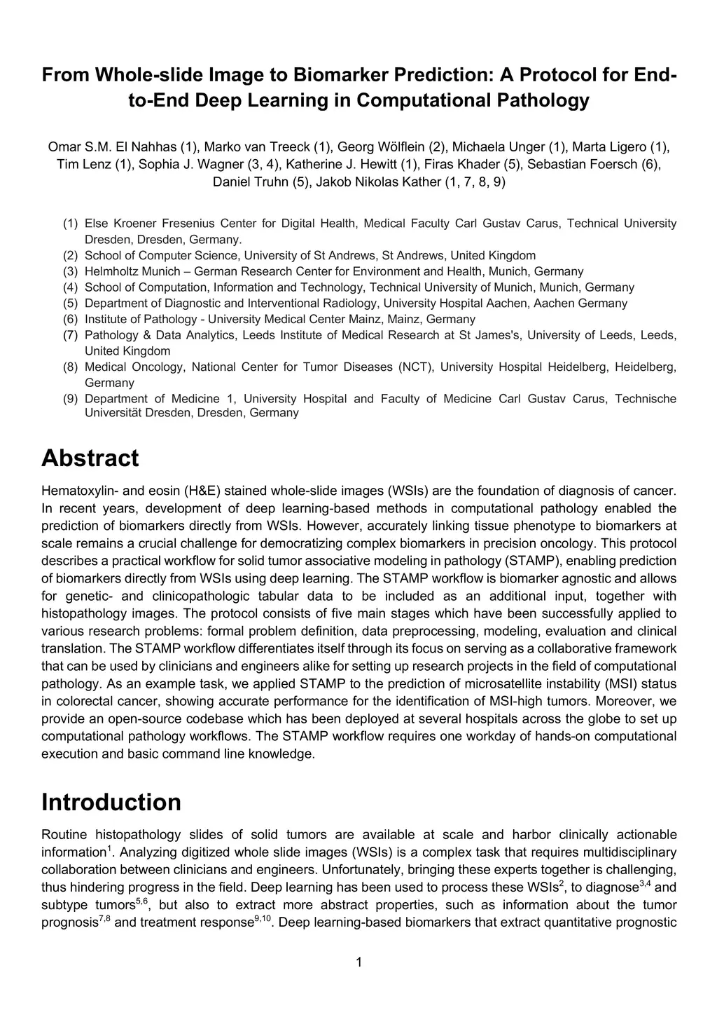 Hematoxylin- and eosin (H&E) stained whole-slide images (WSIs) are the foundation of diagnosis of cancer. In recent years, development of deep learning-based methods in computational pathology enabled the prediction of biomarkers directly from WSIs. However, accurately linking tissue phenotype to biomarkers at scale remains a crucial challenge for democratizing complex biomarkers in precision oncology. This protocol describes a practical workflow for solid tumor associative modeling in pathology (STAMP), enabling prediction of biomarkers directly from WSIs using deep learning. The STAMP workflow is biomarker agnostic and allows for genetic- and clinicopathologic tabular data to be included as an additional input, together with histopathology images. The protocol consists of five main stages which have been successfully applied to various research problems: formal problem definition, data preprocessing, modeling, evaluation and clinical translation. The STAMP workflow differentiates itself through its focus on serving as a collaborative framework that can be used by clinicians and engineers alike for setting up research projects in the field of computational pathology. As an example task, we applied STAMP to the prediction of microsatellite instability (MSI) status in colorectal cancer, showing accurate performance for the identification of MSI-high tumors. Moreover, we provide an open-source codebase which has been deployed at several hospitals across the globe to set up computational pathology workflows. The STAMP workflow requires one workday of hands-on computational execution and basic command line knowledge.