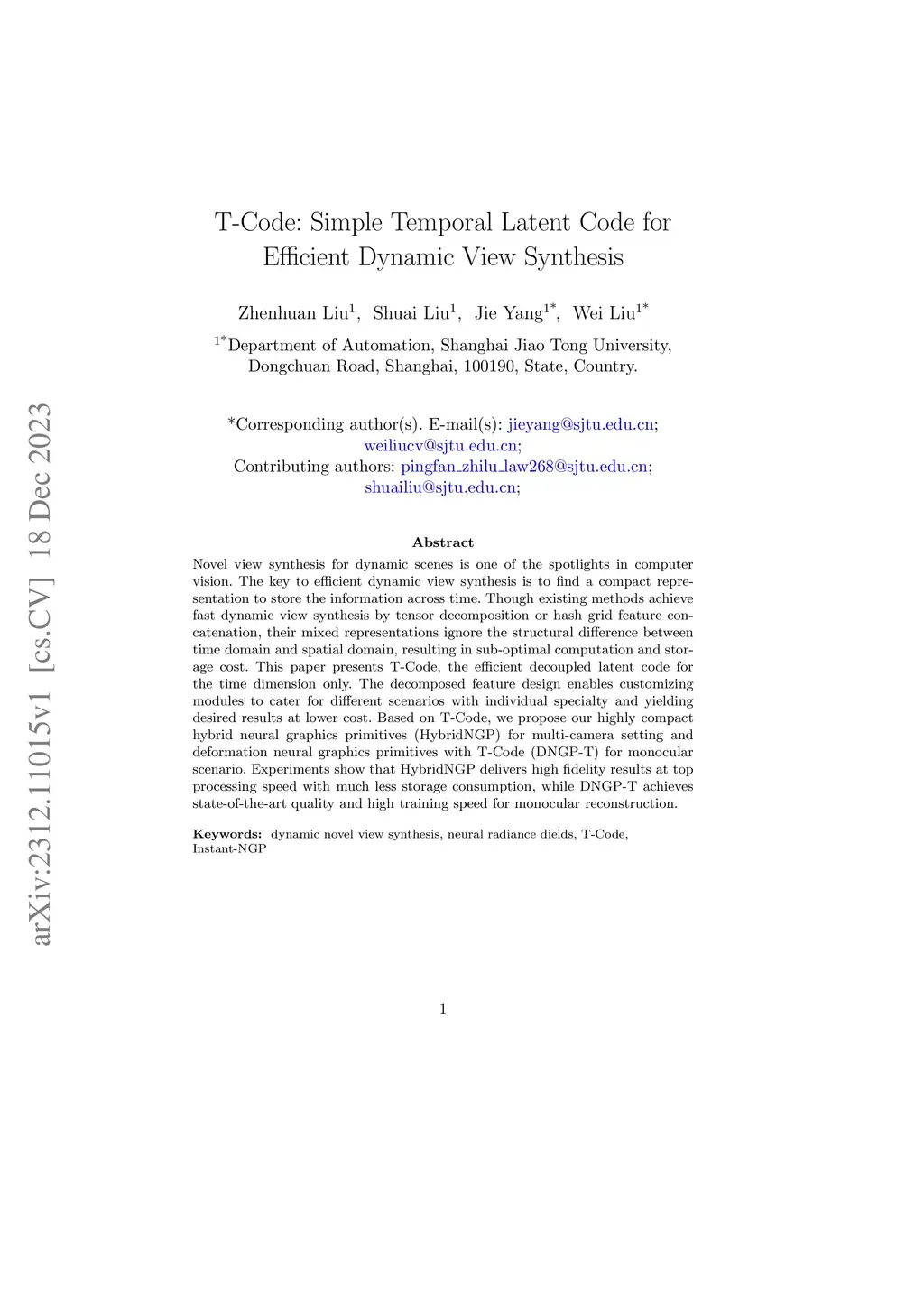 Novel view synthesis for dynamic scenes is one of the spotlights in computer vision. The key to efficient dynamic view synthesis is to find a compact representation to store the information across time. Though existing methods achieve fast dynamic view synthesis by tensor decomposition or hash grid feature concatenation, their mixed representations ignore the structural difference between time domain and spatial domain, resulting in sub-optimal computation and storage cost. This paper presents T-Code, the efficient decoupled latent code for the time dimension only. The decomposed feature design enables customizing modules to cater for different scenarios with individual specialty and yielding desired results at lower cost. Based on T-Code, we propose our highly compact hybrid neural graphics primitives (HybridNGP) for multi-camera setting and deformation neural graphics primitives with T-Code (DNGP-T) for monocular scenario. Experiments show that HybridNGP delivers high fidelity results at top processing speed with much less storage consumption, while DNGP-T achieves state-of-the-art quality and high training speed for monocular reconstruction.