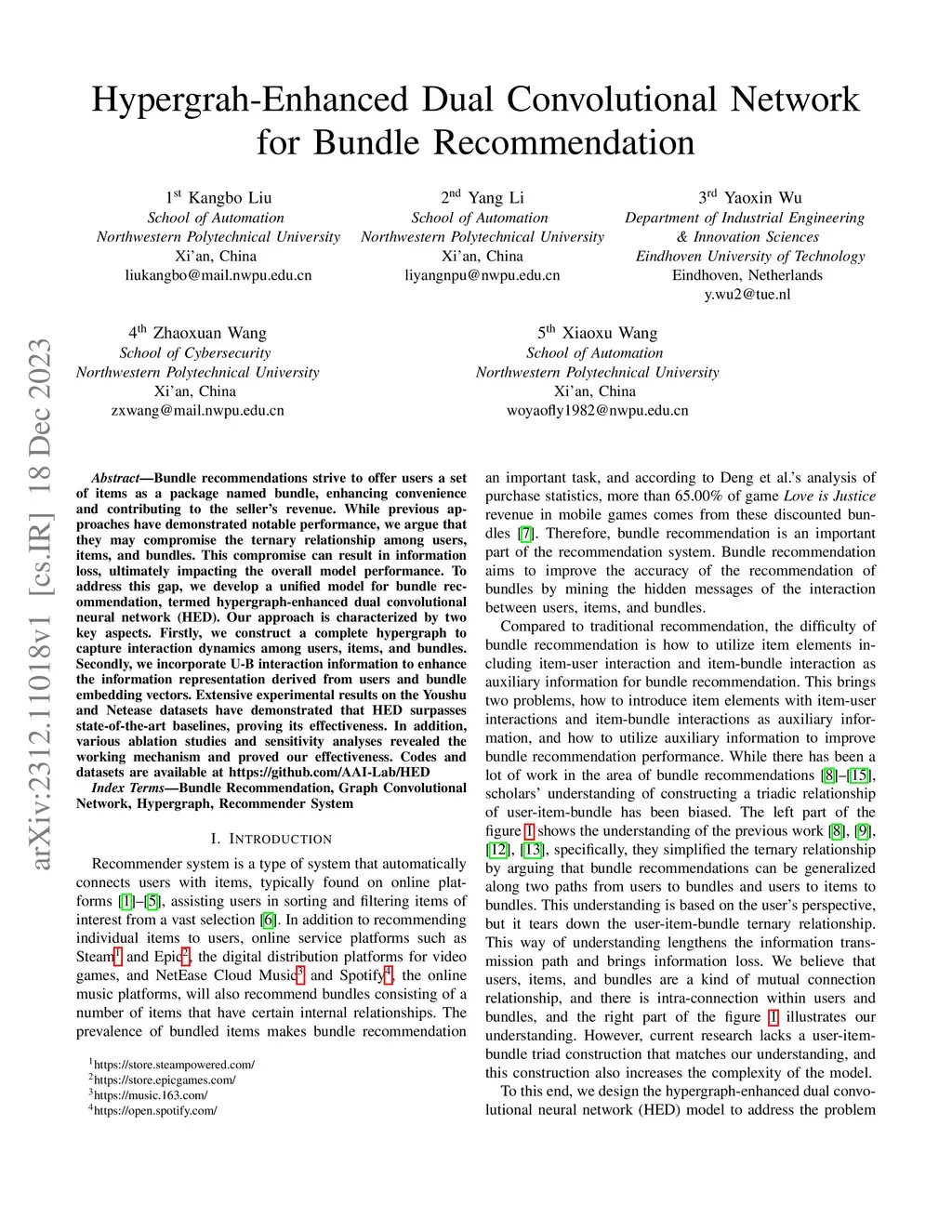 Bundle recommendations strive to offer users a set of items as a package named bundle, enhancing convenience and contributing to the seller's revenue. While previous approaches have demonstrated notable performance, we argue that they may compromise the ternary relationship among users, items, and bundles. This compromise can result in information loss, ultimately impacting the overall model performance. To address this gap, we develop a unified model for bundle recommendation, termed hypergraph-enhanced dual convolutional neural network (HED). Our approach is characterized by two key aspects. Firstly, we construct a complete hypergraph to capture interaction dynamics among users, items, and bundles. Secondly, we incorporate U-B interaction information to enhance the information representation derived from users and bundle embedding vectors. Extensive experimental results on the Youshu and Netease datasets have demonstrated that HED surpasses state-of-the-art baselines, proving its effectiveness. In addition, various ablation studies and sensitivity analyses revealed the working mechanism and proved our effectiveness. Codes and datasets are available at https://github.com/AAI-Lab/HED