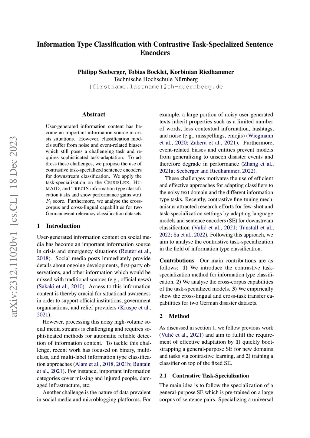 User-generated information content has become an important information source in crisis situations. However, classification models suffer from noise and event-related biases which still poses a challenging task and requires sophisticated task-adaptation. To address these challenges, we propose the use of contrastive task-specialized sentence encoders for downstream classification. We apply the task-specialization on the CrisisLex, HumAID, and TrecIS information type classification tasks and show performance gains w.r.t. F1-score. Furthermore, we analyse the cross-corpus and cross-lingual capabilities for two German event relevancy classification datasets.
