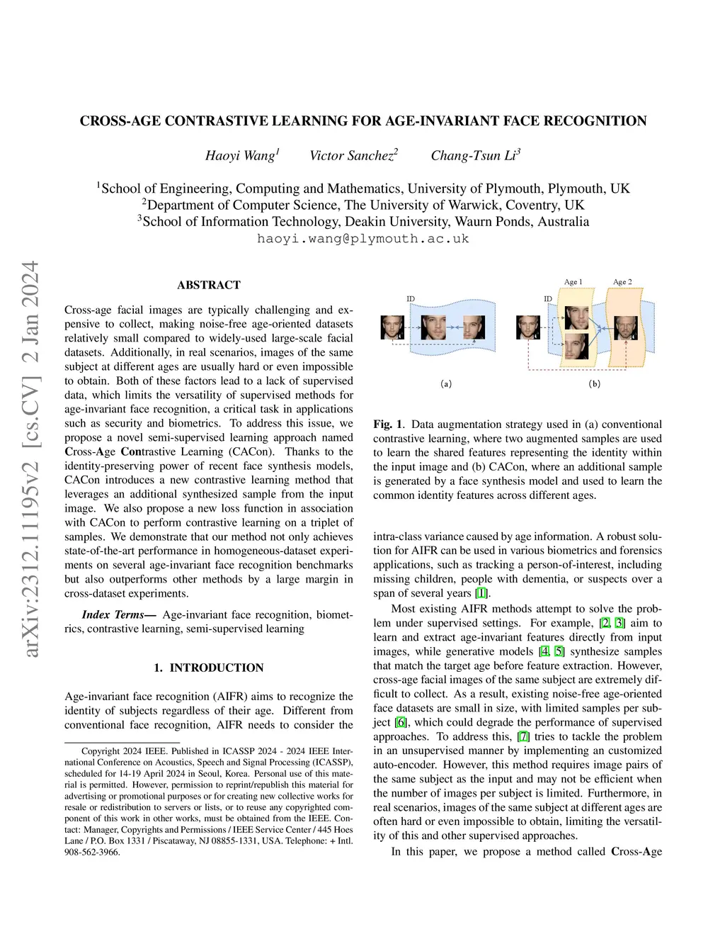 Cross-age facial images are typically challenging and expensive to collect, making noise-free age-oriented datasets relatively small compared to widely-used large-scale facial datasets. Additionally, in real scenarios, images of the same subject at different ages are usually hard or even impossible to obtain. Both of these factors lead to a lack of supervised data, which limits the versatility of supervised methods for age-invariant face recognition, a critical task in applications such as security and biometrics. To address this issue, we propose a novel semi-supervised learning approach named Cross-Age Contrastive Learning (CACon). Thanks to the identity-preserving power of recent face synthesis models, CACon introduces a new contrastive learning method that leverages an additional synthesized sample from the input image. We also propose a new loss function in association with CACon to perform contrastive learning on a triplet of samples. We demonstrate that our method not only achieves state-of-the-art performance in homogeneous-dataset experiments on several age-invariant face recognition benchmarks but also outperforms other methods by a large margin in cross-dataset experiments.