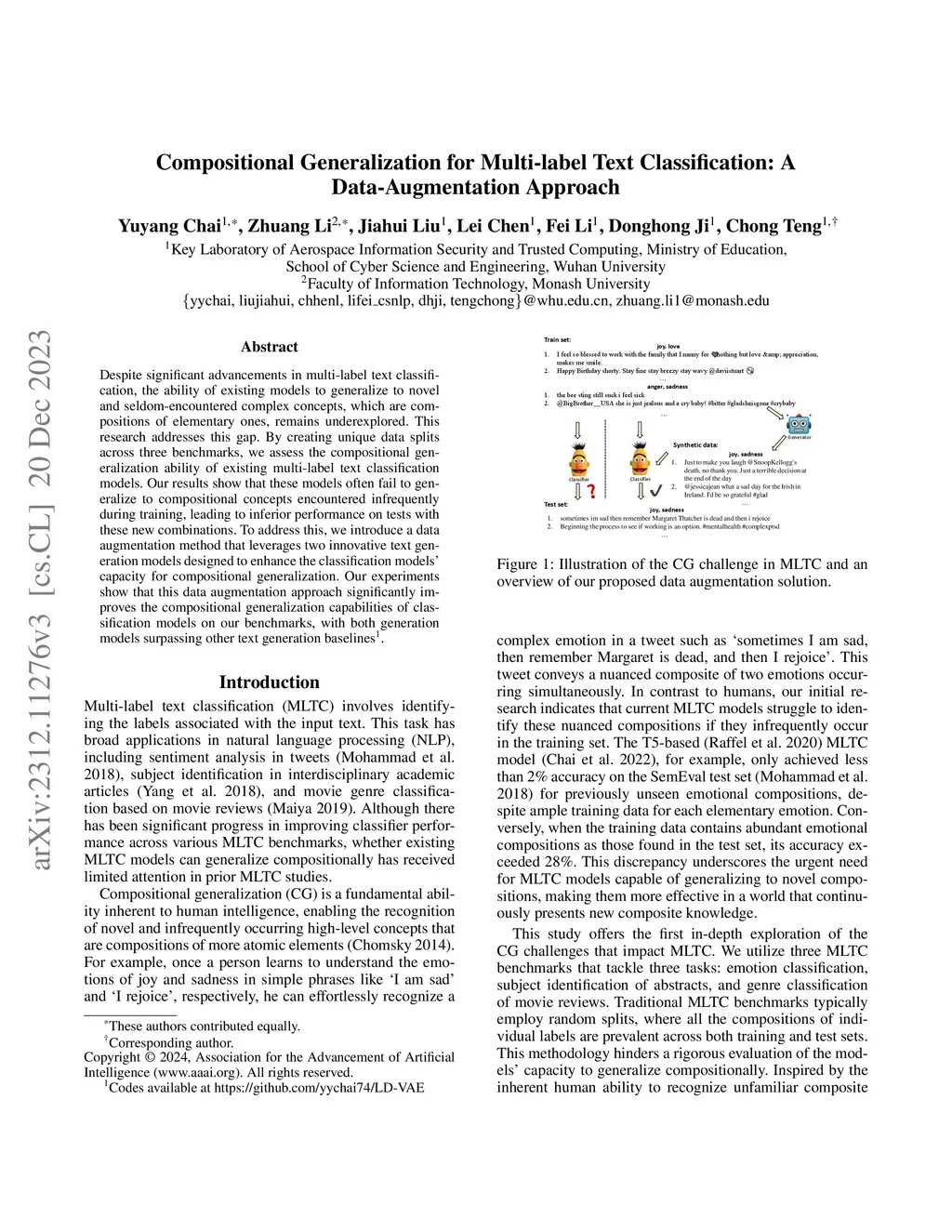 Despite significant advancements in multi-label text classification, the ability of existing models to generalize to novel and seldom-encountered complex concepts, which are compositions of elementary ones, remains underexplored. This research addresses this gap. By creating unique data splits across three benchmarks, we assess the compositional generalization ability of existing multi-label text classification models. Our results show that these models often fail to generalize to compositional concepts encountered infrequently during training, leading to inferior performance on tests with these new combinations. To address this, we introduce a data augmentation method that leverages two innovative text generation models designed to enhance the classification models' capacity for compositional generalization. Our experiments show that this data augmentation approach significantly improves the compositional generalization capabilities of classification models on our benchmarks, with both generation models surpassing other text generation baselines.