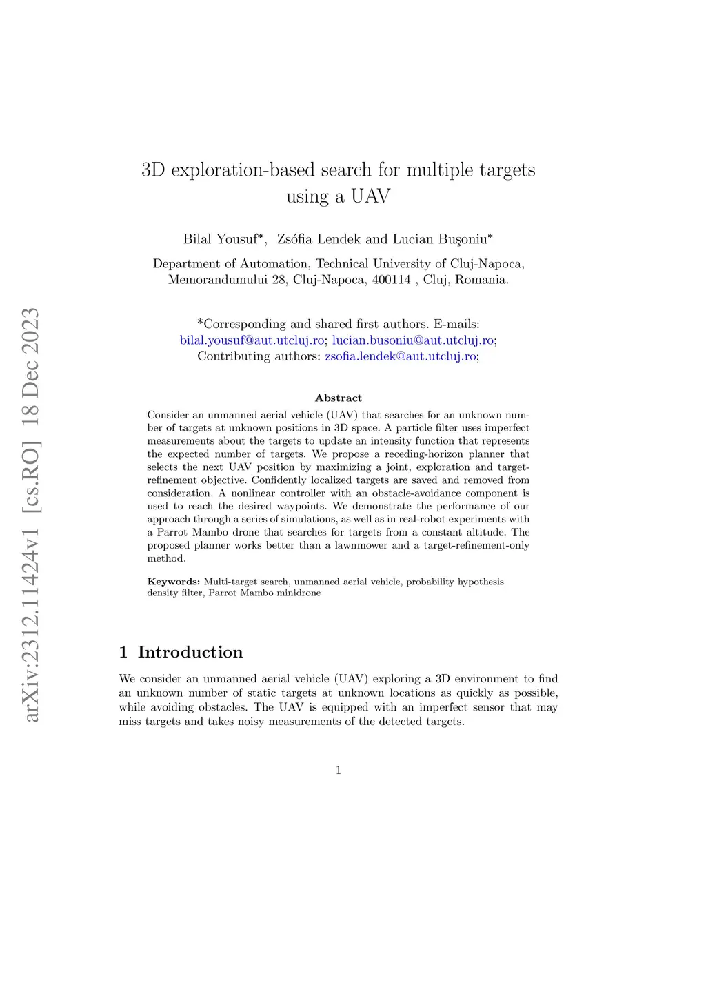 Consider an unmanned aerial vehicle (UAV) that searches for an unknown number of targets at unknown positions in 3D space. A particle filter uses imperfect measurements about the targets to update an intensity function that represents the expected number of targets. We propose a receding-horizon planner that selects the next UAV position by maximizing a joint, exploration and target-refinement objective. Confidently localized targets are saved and removed from consideration. A nonlinear controller with an obstacle-avoidance component is used to reach the desired waypoints. We demonstrate the performance of our approach through a series of simulations, as well as in real-robot experiments with a Parrot Mambo drone that searches for targets from a constant altitude. The proposed planner works better than a lawnmower and a target-refinement-only method.