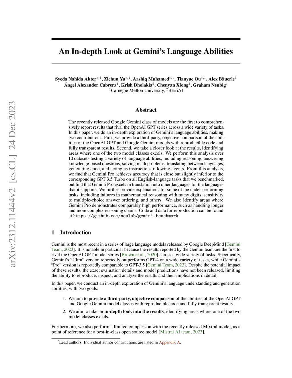 The recently released Google Gemini class of models are the first to comprehensively report results that rival the OpenAI GPT series across a wide variety of tasks. In this paper, we do an in-depth exploration of Gemini's language abilities, making two contributions. First, we provide a third-party, objective comparison of the abilities of the OpenAI GPT and Google Gemini models with reproducible code and fully transparent results. Second, we take a closer look at the results, identifying areas where one of the two model classes excels. We perform this analysis over 10 datasets testing a variety of language abilities, including reasoning, answering knowledge-based questions, solving math problems, translating between languages, generating code, and acting as instruction-following agents. From this analysis, we find that Gemini Pro achieves accuracy that is close but slightly inferior to the corresponding GPT 3.5 Turbo on all tasks that we benchmarked. We further provide explanations for some of this under-performance, including failures in mathematical reasoning with many digits, sensitivity to multiple-choice answer ordering, aggressive content filtering, and others. We also identify areas where Gemini demonstrates comparably high performance, including generation into non-English languages, and handling longer and more complex reasoning chains. Code and data for reproduction can be found at https://github.com/neulab/gemini-benchmark
