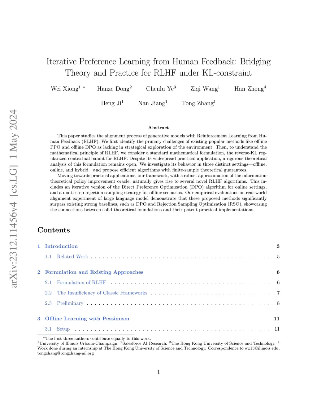 This paper studies the alignment process of generative models with Reinforcement Learning from Human Feedback (RLHF). We first identify the primary challenges of existing popular methods like offline PPO and offline DPO as lacking in strategical exploration of the environment. Then, to understand the mathematical principle of RLHF, we consider a standard mathematical formulation, the reverse-KL regularized contextual bandit for RLHF. Despite its widespread practical application, a rigorous theoretical analysis of this formulation remains open. We investigate its behavior in three distinct settings -- offline, online, and hybrid -- and propose efficient algorithms with finite-sample theoretical guarantees. Moving towards practical applications, our framework, with a robust approximation of the information-theoretical policy improvement oracle, naturally gives rise to several novel RLHF algorithms. This includes an iterative version of the Direct Preference Optimization (DPO) algorithm for online settings, and a multi-step rejection sampling strategy for offline scenarios. Our empirical evaluations on real-world alignment experiment of large language model demonstrate that these proposed methods significantly surpass existing strong baselines, such as DPO and Rejection Sampling Optimization (RSO), showcasing the connections between solid theoretical foundations and their potent practical implementations.