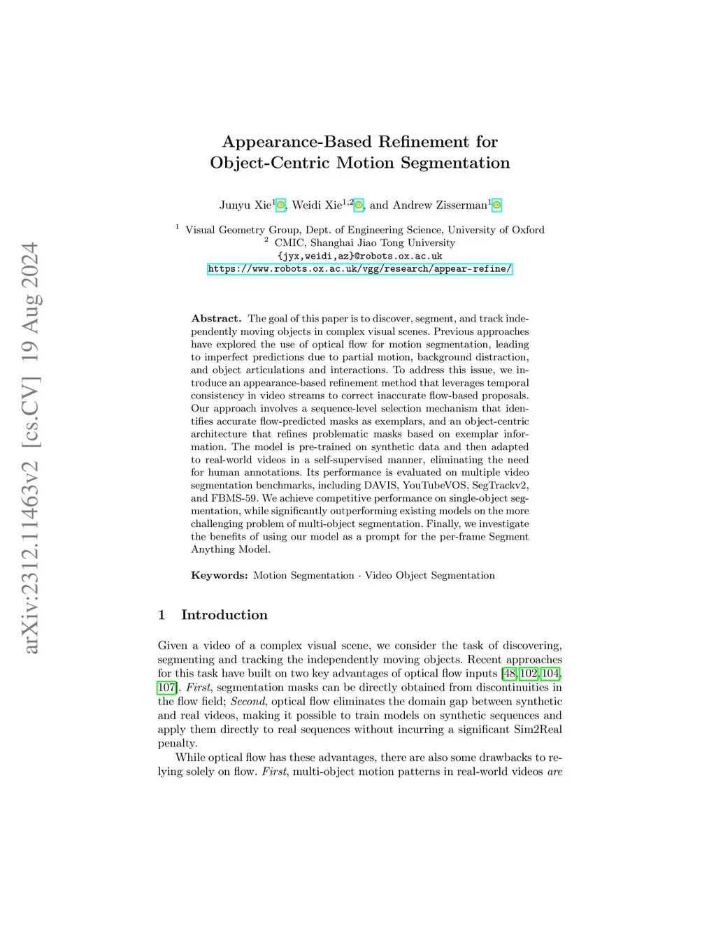 The goal of this paper is to discover, segment, and track independently moving objects in complex visual scenes. Previous approaches have explored the use of optical flow for motion segmentation, leading to imperfect predictions due to partial motion, background distraction, and object articulations and interactions. To address this issue, we introduce an appearance-based refinement method that leverages temporal consistency in video streams to correct inaccurate flow-based proposals. Our approach involves a simple selection mechanism that identifies accurate flow-predicted masks as exemplars, and an object-centric architecture that refines problematic masks based on exemplar information. The model is pre-trained on synthetic data and then adapted to real-world videos in a self-supervised manner, eliminating the need for human annotations. Its performance is evaluated on multiple video segmentation benchmarks, including DAVIS, YouTubeVOS, SegTrackv2, and FBMS-59. We achieve competitive performance on single-object segmentation, while significantly outperforming existing models on the more challenging problem of multi-object segmentation. Finally, we investigate the benefits of using our model as a prompt for a per-frame Segment Anything Model.