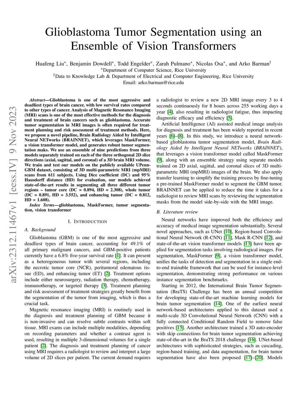 Glioblastoma is one of the most aggressive and deadliest types of brain cancer, with low survival rates compared to other types of cancer. Analysis of Magnetic Resonance Imaging (MRI) scans is one of the most effective methods for the diagnosis and treatment of brain cancers such as glioblastoma. Accurate tumor segmentation in MRI images is often required for treatment planning and risk assessment of treatment methods. Here, we propose a novel pipeline, Brain Radiology Aided by Intelligent Neural NETworks (BRAINNET), which leverages MaskFormer, a vision transformer model, and generates robust tumor segmentation maks. We use an ensemble of nine predictions from three models separately trained on each of the three orthogonal 2D slice directions (axial, sagittal, and coronal) of a 3D brain MRI volume. We train and test our models on the publicly available UPenn-GBM dataset, consisting of 3D multi-parametric MRI (mpMRI) scans from 611 subjects. Using Dice coefficient (DC) and 95% Hausdorff distance (HD) for evaluation, our models achieved state-of-the-art results in segmenting all three different tumor regions -- tumor core (DC = 0.894, HD = 2.308), whole tumor (DC = 0.891, HD = 3.552), and enhancing tumor (DC = 0.812, HD = 1.608).