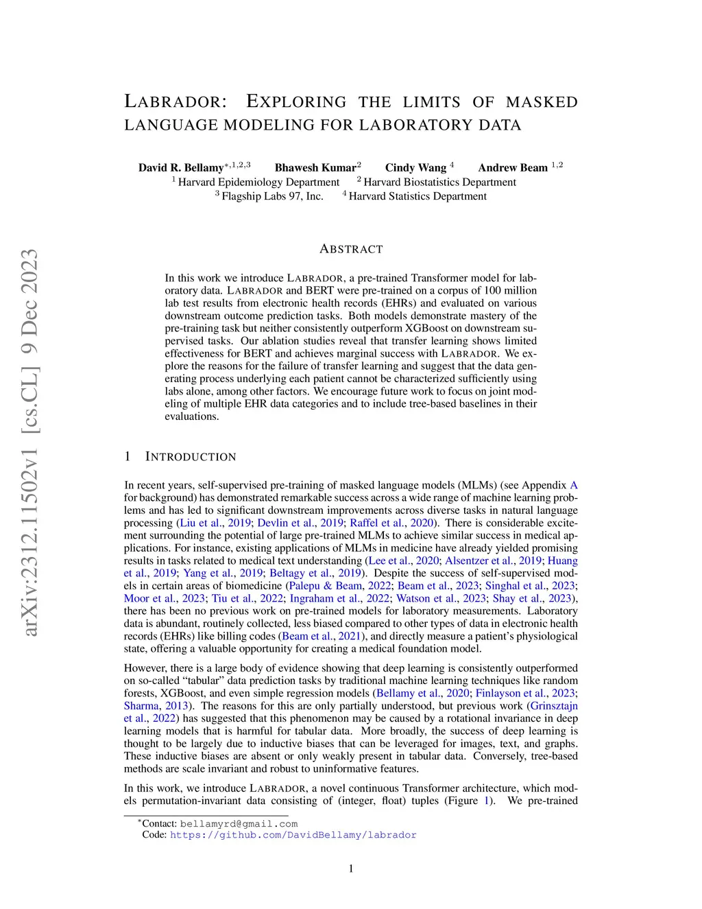 In this work we introduce Labrador, a pre-trained Transformer model for laboratory data. Labrador and BERT were pre-trained on a corpus of 100 million lab test results from electronic health records (EHRs) and evaluated on various downstream outcome prediction tasks. Both models demonstrate mastery of the pre-training task but neither consistently outperform XGBoost on downstream supervised tasks. Our ablation studies reveal that transfer learning shows limited effectiveness for BERT and achieves marginal success with Labrador. We explore the reasons for the failure of transfer learning and suggest that the data generating process underlying each patient cannot be characterized sufficiently using labs alone, among other factors. We encourage future work to focus on joint modeling of multiple EHR data categories and to include tree-based baselines in their evaluations.
