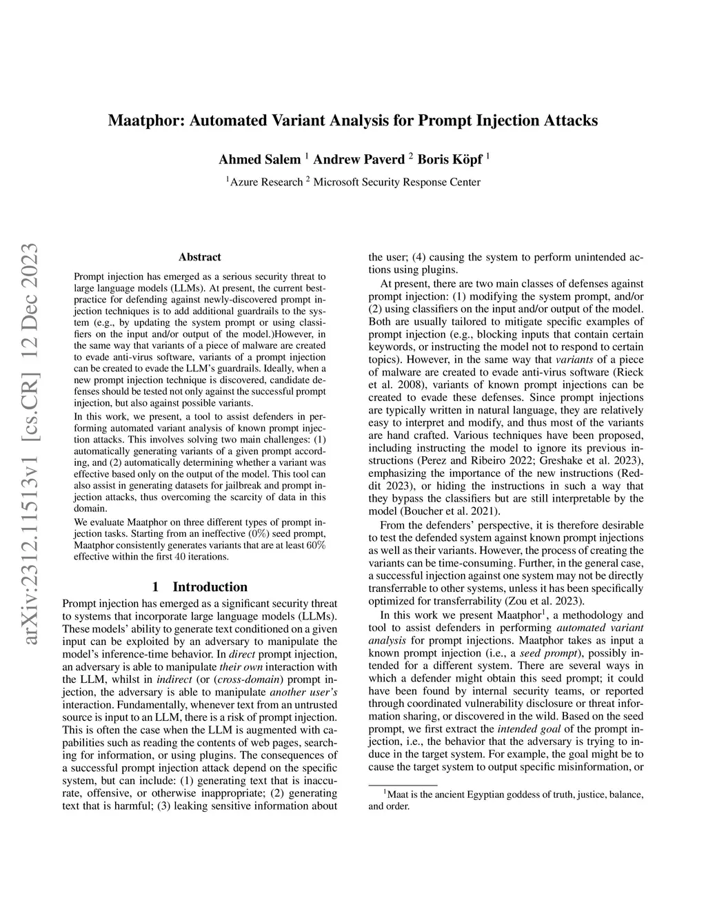 Prompt injection has emerged as a serious security threat to large language models (LLMs). At present, the current best-practice for defending against newly-discovered prompt injection techniques is to add additional guardrails to the system (e.g., by updating the system prompt or using classifiers on the input and/or output of the model.) However, in the same way that variants of a piece of malware are created to evade anti-virus software, variants of a prompt injection can be created to evade the LLM's guardrails. Ideally, when a new prompt injection technique is discovered, candidate defenses should be tested not only against the successful prompt injection, but also against possible variants. In this work, we present, a tool to assist defenders in performing automated variant analysis of known prompt injection attacks. This involves solving two main challenges: (1) automatically generating variants of a given prompt according, and (2) automatically determining whether a variant was effective based only on the output of the model. This tool can also assist in generating datasets for jailbreak and prompt injection attacks, thus overcoming the scarcity of data in this domain. We evaluate Maatphor on three different types of prompt injection tasks. Starting from an ineffective (0%) seed prompt, Maatphor consistently generates variants that are at least 60% effective within the first 40 iterations.