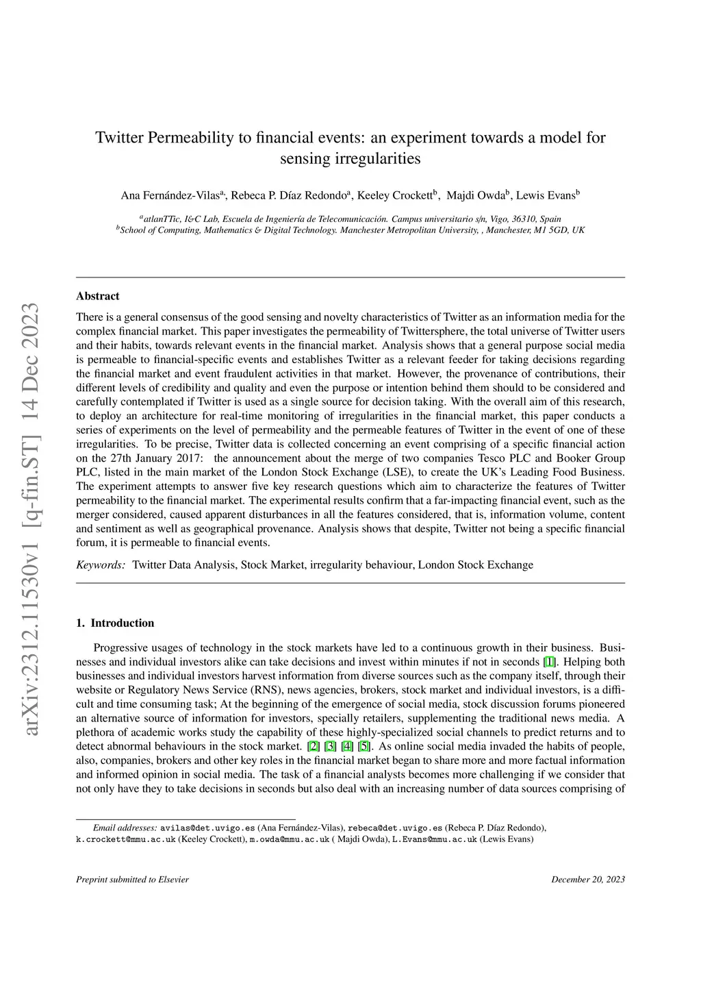 There is a general consensus of the good sensing and novelty characteristics of Twitter as an information media for the complex financial market. This paper investigates the permeability of Twittersphere, the total universe of Twitter users and their habits, towards relevant events in the financial market. Analysis shows that a general purpose social media is permeable to financial-specific events and establishes Twitter as a relevant feeder for taking decisions regarding the financial market and event fraudulent activities in that market. However, the provenance of contributions, their different levels of credibility and quality and even the purpose or intention behind them should to be considered and carefully contemplated if Twitter is used as a single source for decision taking. With the overall aim of this research, to deploy an architecture for real-time monitoring of irregularities in the financial market, this paper conducts a series of experiments on the level of permeability and the permeable features of Twitter in the event of one of these irregularities. To be precise, Twitter data is collected concerning an event comprising of a specific financial action on the 27th January 2017:{~ }the announcement about the merge of two companies Tesco PLC and Booker Group PLC, listed in the main market of the London Stock Exchange (LSE), to create the UK's Leading Food Business. The experiment attempts to answer five key research questions which aim to characterize the features of Twitter permeability to the financial market. The experimental results confirm that a far-impacting financial event, such as the merger considered, caused apparent disturbances in all the features considered, that is, information volume, content and sentiment as well as geographical provenance. Analysis shows that despite, Twitter not being a specific financial forum, it is permeable to financial events.