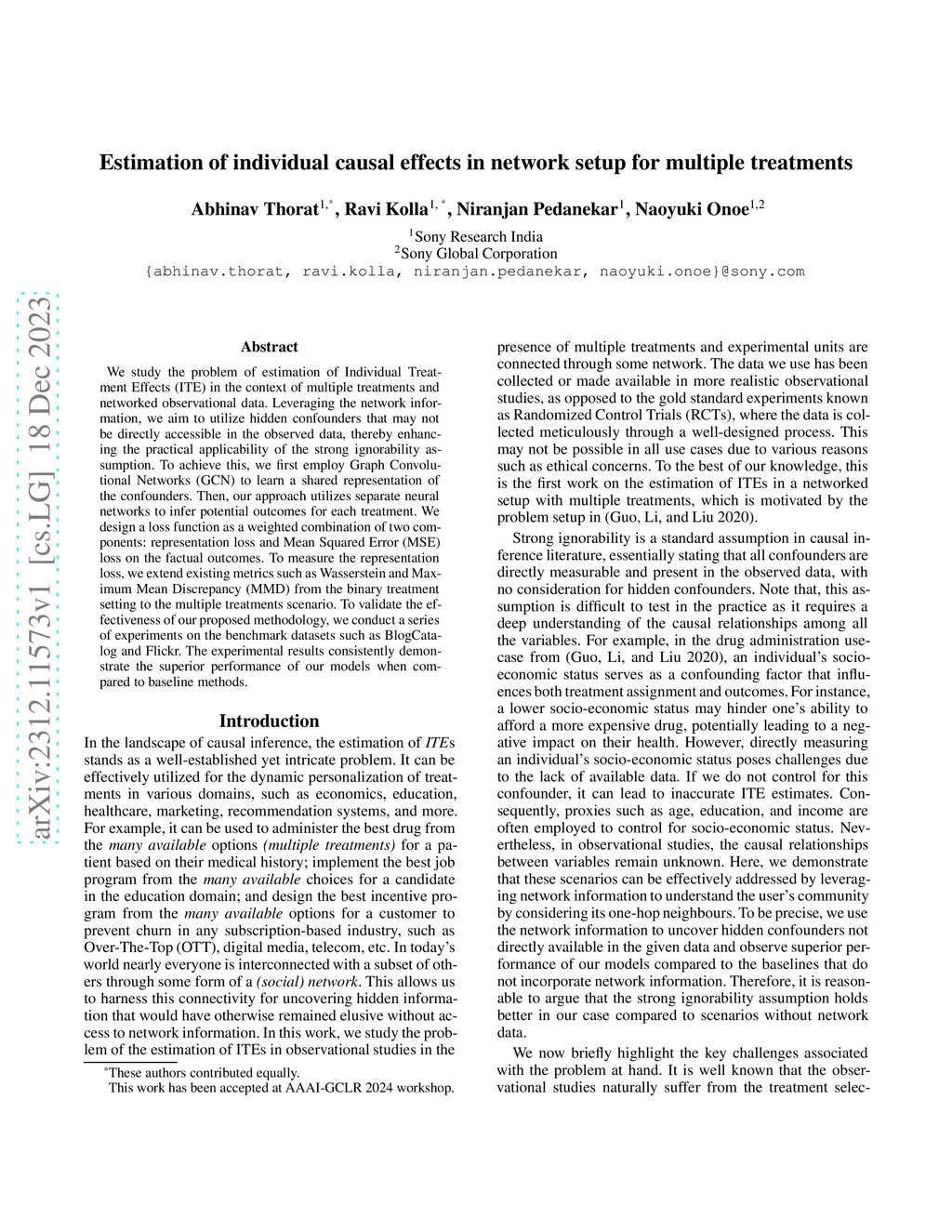 We study the problem of estimation of Individual Treatment Effects (ITE) in the context of multiple treatments and networked observational data. Leveraging the network information, we aim to utilize hidden confounders that may not be directly accessible in the observed data, thereby enhancing the practical applicability of the strong ignorability assumption. To achieve this, we first employ Graph Convolutional Networks (GCN) to learn a shared representation of the confounders. Then, our approach utilizes separate neural networks to infer potential outcomes for each treatment. We design a loss function as a weighted combination of two components: representation loss and Mean Squared Error (MSE) loss on the factual outcomes. To measure the representation loss, we extend existing metrics such as Wasserstein and Maximum Mean Discrepancy (MMD) from the binary treatment setting to the multiple treatments scenario. To validate the effectiveness of our proposed methodology, we conduct a series of experiments on the benchmark datasets such as BlogCatalog and Flickr. The experimental results consistently demonstrate the superior performance of our models when compared to baseline methods.