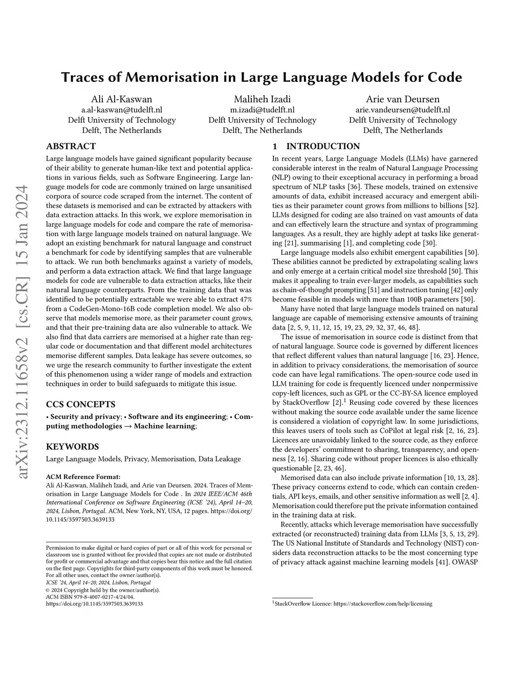 Traces of Memorisation in Large Language Models for Code
