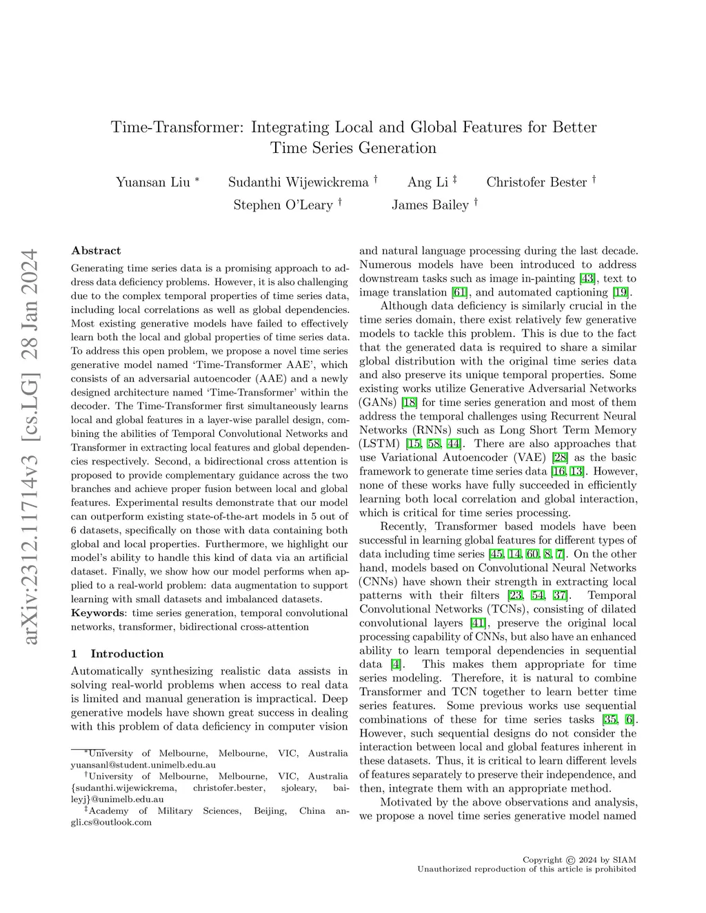 Generating time series data is a promising approach to address data deficiency problems. However, it is also challenging due to the complex temporal properties of time series data, including local correlations as well as global dependencies. Most existing generative models have failed to effectively learn both the local and global properties of time series data. To address this open problem, we propose a novel time series generative model named 'Time-Transformer AAE', which consists of an adversarial autoencoder (AAE) and a newly designed architecture named 'Time-Transformer' within the decoder. The Time-Transformer first simultaneously learns local and global features in a layer-wise parallel design, combining the abilities of Temporal Convolutional Networks and Transformer in extracting local features and global dependencies respectively. Second, a bidirectional cross attention is proposed to provide complementary guidance across the two branches and achieve proper fusion between local and global features. Experimental results demonstrate that our model can outperform existing state-of-the-art models in 5 out of 6 datasets, specifically on those with data containing both global and local properties. Furthermore, we highlight our model's advantage on handling this kind of data via an artificial dataset. Finally, we show our model's ability to address a real-world problem: data augmentation to support learning with small datasets and imbalanced datasets.