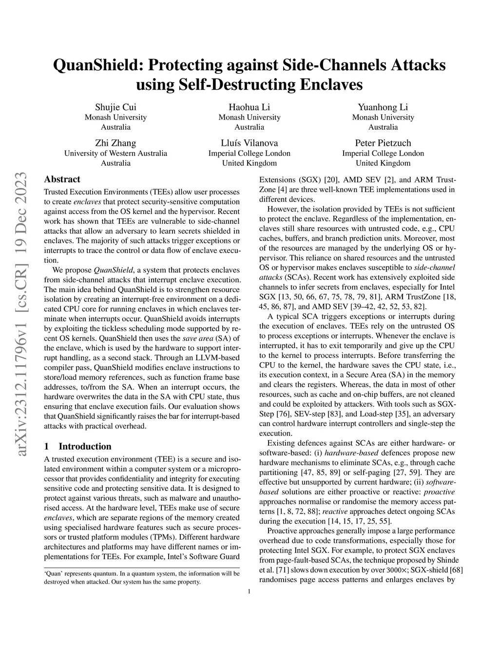 Trusted Execution Environments (TEEs) allow user processes to create enclaves that protect security-sensitive computation against access from the OS kernel and the hypervisor. Recent work has shown that TEEs are vulnerable to side-channel attacks that allow an adversary to learn secrets shielded in enclaves. The majority of such attacks trigger exceptions or interrupts to trace the control or data flow of enclave execution. We propose QuanShield, a system that protects enclaves from side-channel attacks that interrupt enclave execution. The main idea behind QuanShield is to strengthen resource isolation by creating an interrupt-free environment on a dedicated CPU core for running enclaves in which enclaves terminate when interrupts occur. QuanShield avoids interrupts by exploiting the tickless scheduling mode supported by recent OS kernels. QuanShield then uses the save area (SA) of the enclave, which is used by the hardware to support interrupt handling, as a second stack. Through an LLVM-based compiler pass, QuanShield modifies enclave instructions to store/load memory references, such as function frame base addresses, to/from the SA. When an interrupt occurs, the hardware overwrites the data in the SA with CPU state, thus ensuring that enclave execution fails. Our evaluation shows that QuanShield significantly raises the bar for interrupt-based attacks with practical overhead.