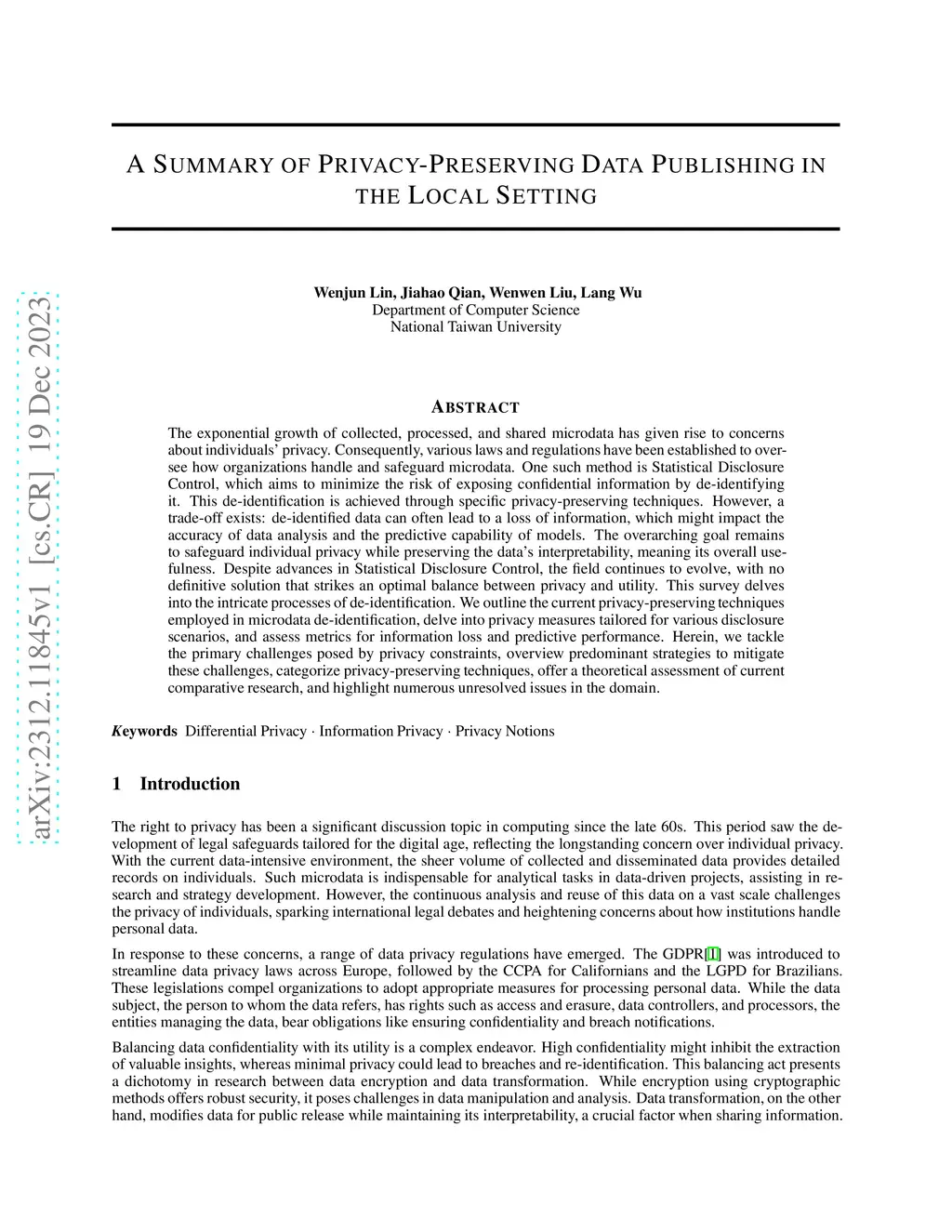 A Summary of Privacy-Preserving Data Publishing in the Local Setting