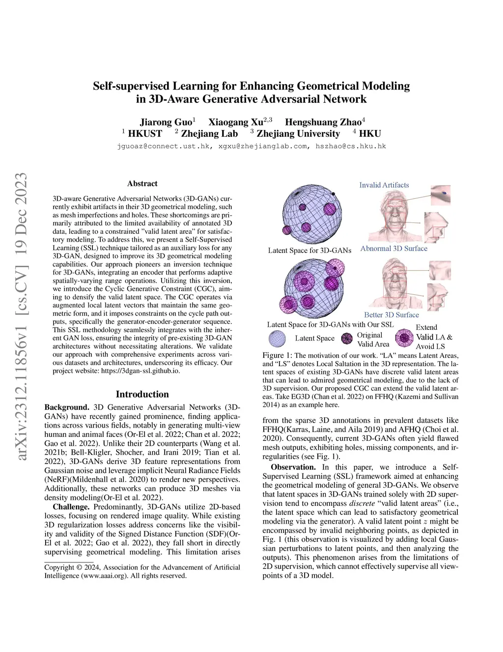3D-aware Generative Adversarial Networks (3D-GANs) currently exhibit artifacts in their 3D geometrical modeling, such as mesh imperfections and holes. These shortcomings are primarily attributed to the limited availability of annotated 3D data, leading to a constrained "valid latent area" for satisfactory modeling. To address this, we present a Self-Supervised Learning (SSL) technique tailored as an auxiliary loss for any 3D-GAN, designed to improve its 3D geometrical modeling capabilities. Our approach pioneers an inversion technique for 3D-GANs, integrating an encoder that performs adaptive spatially-varying range operations. Utilizing this inversion, we introduce the Cyclic Generative Constraint (CGC), aiming to densify the valid latent space. The CGC operates via augmented local latent vectors that maintain the same geometric form, and it imposes constraints on the cycle path outputs, specifically the generator-encoder-generator sequence. This SSL methodology seamlessly integrates with the inherent GAN loss, ensuring the integrity of pre-existing 3D-GAN architectures without necessitating alterations. We validate our approach with comprehensive experiments across various datasets and architectures, underscoring its efficacy. Our project website: https://3dgan-ssl.github.io