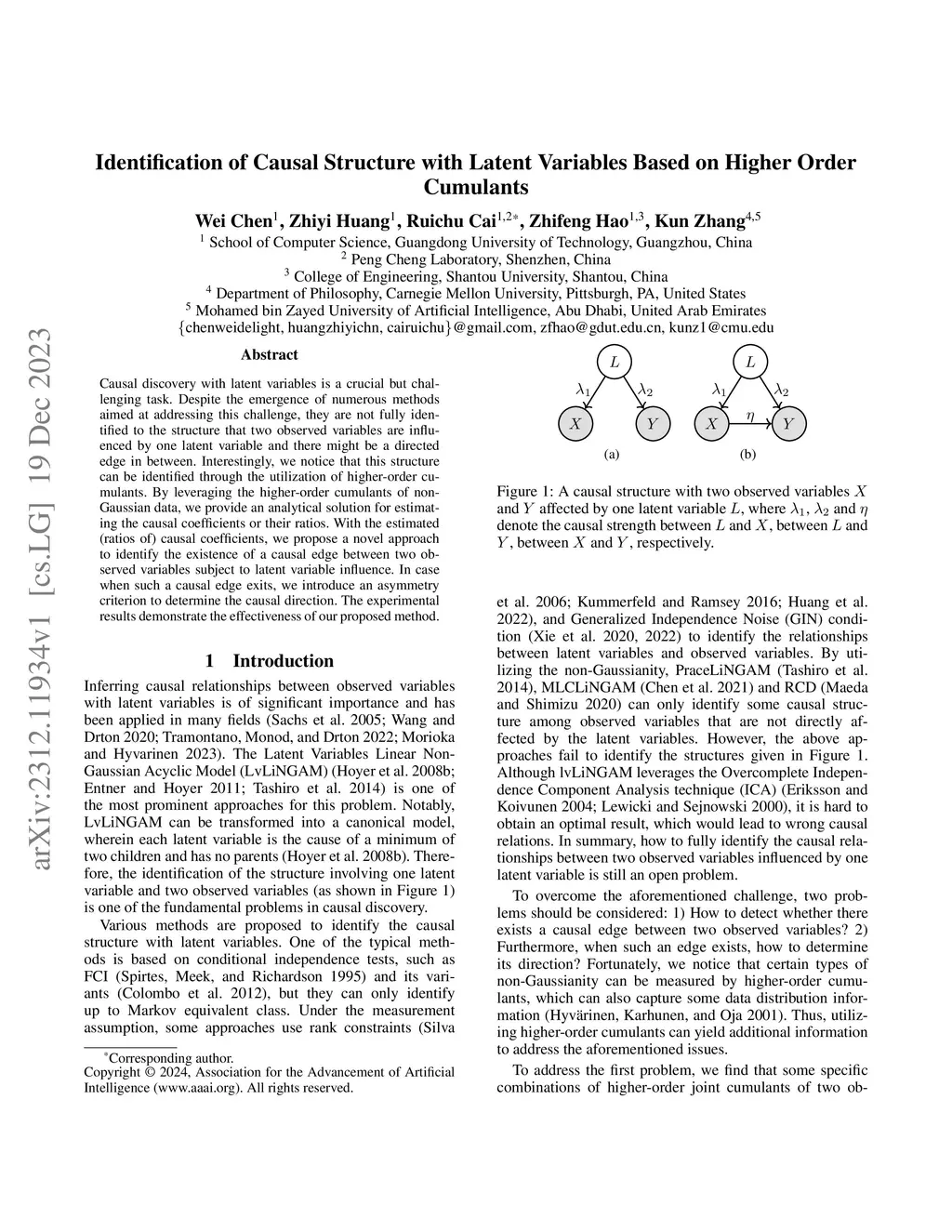 Causal discovery with latent variables is a crucial but challenging task. Despite the emergence of numerous methods aimed at addressing this challenge, they are not fully identified to the structure that two observed variables are influenced by one latent variable and there might be a directed edge in between. Interestingly, we notice that this structure can be identified through the utilization of higher-order cumulants. By leveraging the higher-order cumulants of non-Gaussian data, we provide an analytical solution for estimating the causal coefficients or their ratios. With the estimated (ratios of) causal coefficients, we propose a novel approach to identify the existence of a causal edge between two observed variables subject to latent variable influence. In case when such a causal edge exits, we introduce an asymmetry criterion to determine the causal direction. The experimental results demonstrate the effectiveness of our proposed method.
