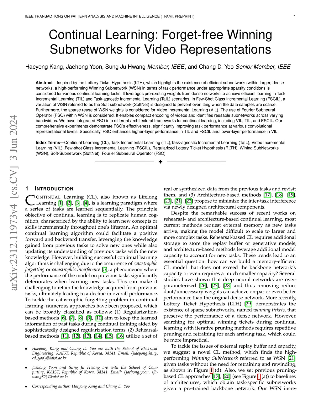 Inspired by the Lottery Ticket Hypothesis (LTH), which highlights the existence of efficient subnetworks within larger, dense networks, a high-performing Winning Subnetwork (WSN) in terms of task performance under appropriate sparsity conditions is considered for various continual learning tasks. It leverages pre-existing weights from dense networks to achieve efficient learning in Task Incremental Learning (TIL) and Task-agnostic Incremental Learning (TaIL) scenarios. In Few-Shot Class Incremental Learning (FSCIL), a variation of WSN referred to as the Soft subnetwork (SoftNet) is designed to prevent overfitting when the data samples are scarce. Furthermore, the sparse reuse of WSN weights is considered for Video Incremental Learning (VIL). The use of Fourier Subneural Operator (FSO) within WSN is considered. It enables compact encoding of videos and identifies reusable subnetworks across varying bandwidths. We have integrated FSO into different architectural frameworks for continual learning, including VIL, TIL, and FSCIL. Our comprehensive experiments demonstrate FSO's effectiveness, significantly improving task performance at various convolutional representational levels. Specifically, FSO enhances higher-layer performance in TIL and FSCIL and lower-layer performance in VIL.