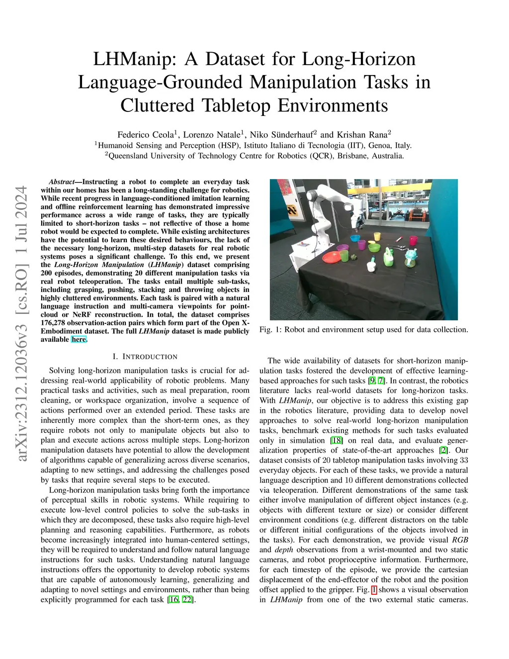 Instructing a robot to complete an everyday task within our homes has been a long-standing challenge for robotics. While recent progress in language-conditioned imitation learning and offline reinforcement learning has demonstrated impressive performance across a wide range of tasks, they are typically limited to short-horizon tasks -- not reflective of those a home robot would be expected to complete. While existing architectures have the potential to learn these desired behaviours, the lack of the necessary long-horizon, multi-step datasets for real robotic systems poses a significant challenge. To this end, we present the Long-Horizon Manipulation (LHManip) dataset comprising 200 episodes, demonstrating 20 different manipulation tasks via real robot teleoperation. The tasks entail multiple sub-tasks, including grasping, pushing, stacking and throwing objects in highly cluttered environments. Each task is paired with a natural language instruction and multi-camera viewpoints for point-cloud or NeRF reconstruction. In total, the dataset comprises 176,278 observation-action pairs which form part of the Open X-Embodiment dataset. The full LHManip dataset is made publicly available at https://github.com/fedeceola/LHManip.