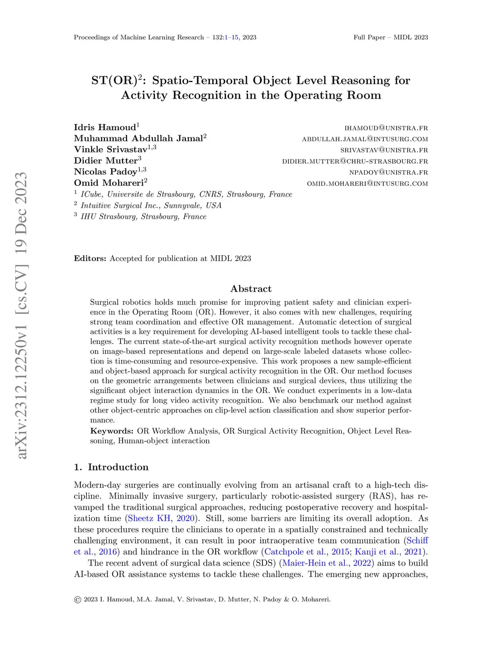 Surgical robotics holds much promise for improving patient safety and clinician experience in the Operating Room (OR). However, it also comes with new challenges, requiring strong team coordination and effective OR management. Automatic detection of surgical activities is a key requirement for developing AI-based intelligent tools to tackle these challenges. The current state-of-the-art surgical activity recognition methods however operate on image-based representations and depend on large-scale labeled datasets whose collection is time-consuming and resource-expensive. This work proposes a new sample-efficient and object-based approach for surgical activity recognition in the OR. Our method focuses on the geometric arrangements between clinicians and surgical devices, thus utilizing the significant object interaction dynamics in the OR. We conduct experiments in a low-data regime study for long video activity recognition. We also benchmark our method againstother object-centric approaches on clip-level action classification and show superior performance.