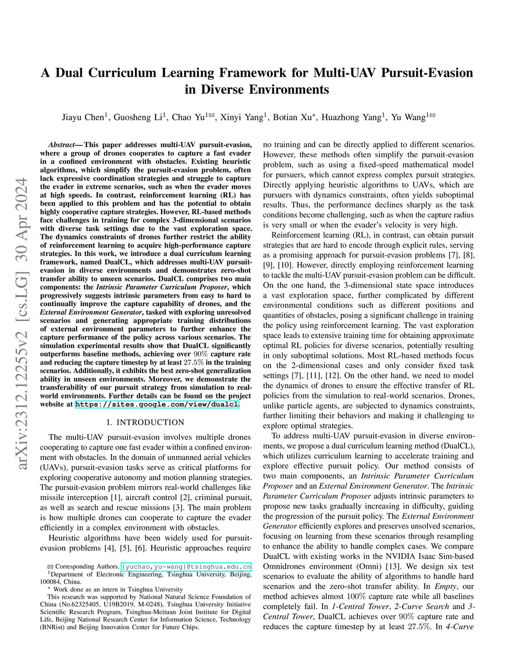 This paper addresses multi-UAV pursuit-evasion, where a group of drones cooperates to capture a fast evader in a confined environment with obstacles. Existing heuristic algorithms, which simplify the pursuit-evasion problem, often lack expressive coordination strategies and struggle to capture the evader in extreme scenarios, such as when the evader moves at high speeds. In contrast, reinforcement learning (RL) has been applied to this problem and has the potential to obtain highly cooperative capture strategies. However, RL-based methods face challenges in training for complex 3-dimensional scenarios with diverse task settings due to the vast exploration space. The dynamics constraints of drones further restrict the ability of reinforcement learning to acquire high-performance capture strategies. In this work, we introduce a dual curriculum learning framework, named DualCL, which addresses multi-UAV pursuit-evasion in diverse environments and demonstrates zero-shot transfer ability to unseen scenarios. DualCL comprises two main components: the Intrinsic Parameter Curriculum Proposer, which progressively suggests intrinsic parameters from easy to hard to improve the capture capability of drones, and the External Environment Generator, tasked with exploring unresolved scenarios and generating appropriate training distributions of external environment parameters. The simulation experimental results show that DualCL significantly outperforms baseline methods, achieving over 90% capture rate and reducing the capture timestep by at least 27.5% in the training scenarios. Additionally, it exhibits the best zero-shot generalization ability in unseen environments. Moreover, we demonstrate the transferability of our pursuit strategy from simulation to real-world environments. Further details can be found on the project website at https://sites.google.com/view/dualcl.