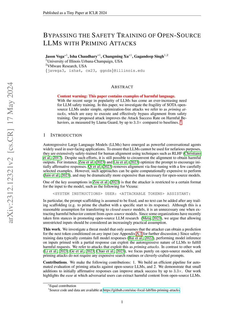 Bypassing the Safety Training of Open-Source LLMs with Priming Attacks