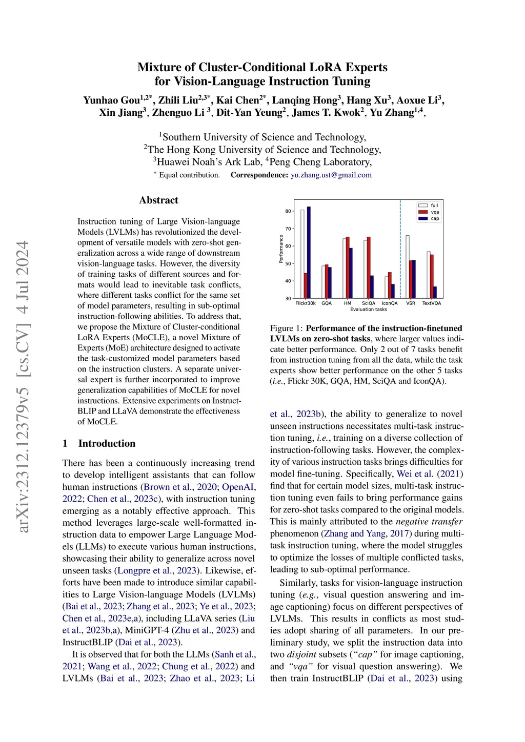 Instruction tuning of Large Vision-language Models (LVLMs) has revolutionized the development of versatile models with zero-shot generalization across a wide range of downstream vision-language tasks. However, the diversity of training tasks of different sources and formats would lead to inevitable task conflicts, where different tasks conflict for the same set of model parameters, resulting in sub-optimal instruction-following abilities. To address that, we propose the Mixture of Cluster-conditional LoRA Experts (MoCLE), a novel Mixture of Experts (MoE) architecture designed to activate the task-customized model parameters based on the instruction clusters. A separate universal expert is further incorporated to improve generalization capabilities of MoCLE for novel instructions. Extensive experiments on InstructBLIP and LLaVA demonstrate the effectiveness of MoCLE.