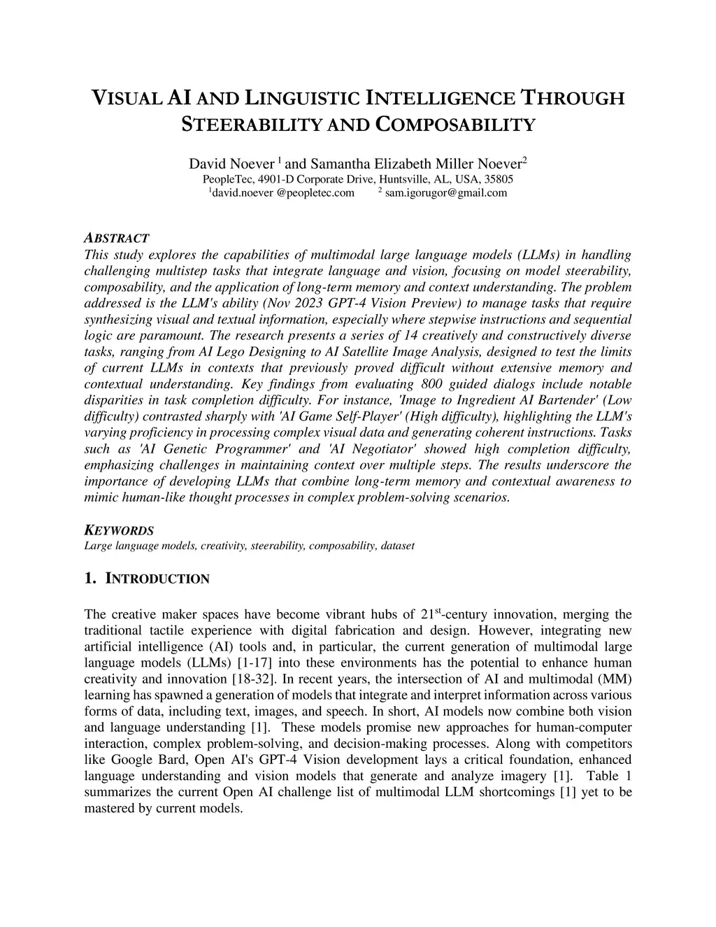 This study explores the capabilities of multimodal large language models (LLMs) in handling challenging multistep tasks that integrate language and vision, focusing on model steerability, composability, and the application of long-term memory and context understanding. The problem addressed is the LLM's ability (Nov 2023 GPT-4 Vision Preview) to manage tasks that require synthesizing visual and textual information, especially where stepwise instructions and sequential logic are paramount. The research presents a series of 14 creatively and constructively diverse tasks, ranging from AI Lego Designing to AI Satellite Image Analysis, designed to test the limits of current LLMs in contexts that previously proved difficult without extensive memory and contextual understanding. Key findings from evaluating 800 guided dialogs include notable disparities in task completion difficulty. For instance, Ímage to Ingredient AI Bartender' (Low difficulty) contrasted sharply with ÁI Game Self-Player' (High difficulty), highlighting the LLM's varying proficiency in processing complex visual data and generating coherent instructions. Tasks such as ÁI Genetic Programmer' and ÁI Negotiator' showed high completion difficulty, emphasizing challenges in maintaining context over multiple steps. The results underscore the importance of developing LLMs that combine long-term memory and contextual awareness to mimic human-like thought processes in complex problem-solving scenarios.