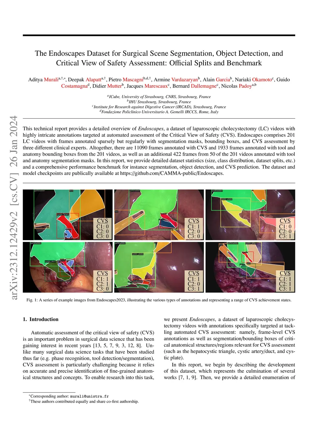 This technical report provides a detailed overview of Endoscapes, a dataset of laparoscopic cholecystectomy (LC) videos with highly intricate annotations targeted at automated assessment of the Critical View of Safety (CVS). Endoscapes comprises 201 LC videos with frames annotated sparsely but regularly with segmentation masks, bounding boxes, and CVS assessment by three different clinical experts. Altogether, there are 11090 frames annotated with CVS and 1933 frames annotated with tool and anatomy bounding boxes from the 201 videos, as well as an additional 422 frames from 50 of the 201 videos annotated with tool and anatomy segmentation masks. In this report, we provide detailed dataset statistics (size, class distribution, dataset splits, etc.) and a comprehensive performance benchmark for instance segmentation, object detection, and CVS prediction. The dataset and model checkpoints are publically available at https://github.com/CAMMA-public/Endoscapes.