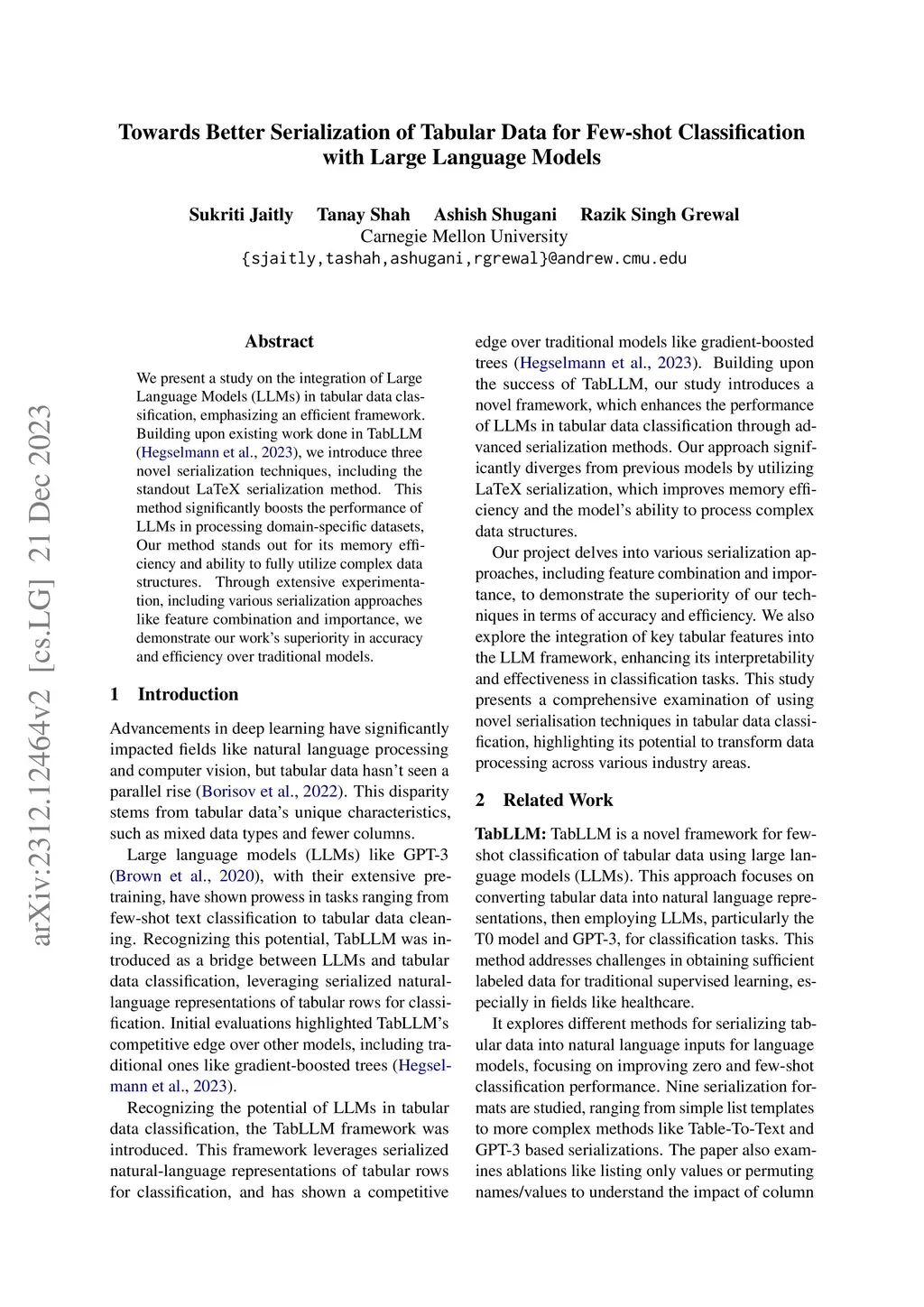 We present a study on the integration of Large Language Models (LLMs) in tabular data classification, emphasizing an efficient framework. Building upon existing work done in TabLLM (arXiv:2210.10723), we introduce three novel serialization techniques, including the standout LaTeX serialization method. This method significantly boosts the performance of LLMs in processing domain-specific datasets, Our method stands out for its memory efficiency and ability to fully utilize complex data structures. Through extensive experimentation, including various serialization approaches like feature combination and importance, we demonstrate our work's superiority in accuracy and efficiency over traditional models.